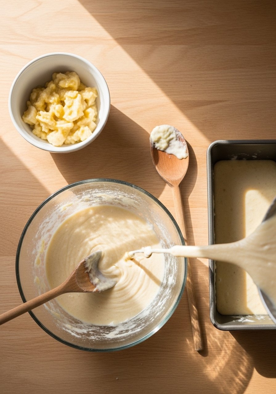 3. Cream butter and sugar, add eggs and vanilla, then bananas, lemon zest/juice, and yogurt.