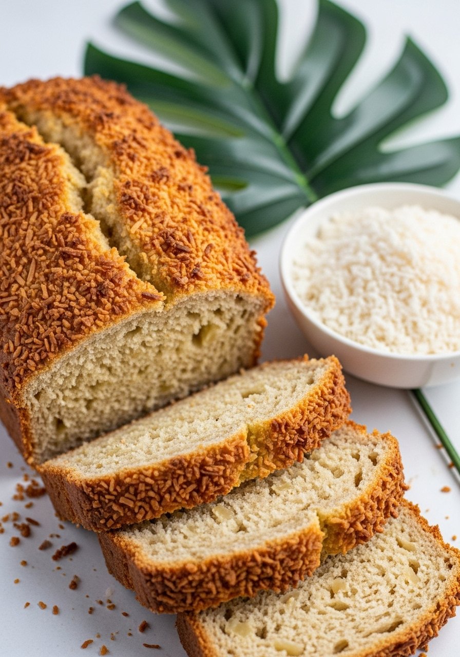 - Preheat oven to 350°F (175°C). Line loaf pan with parchment. Toast coconut and almonds lightly for topping.
