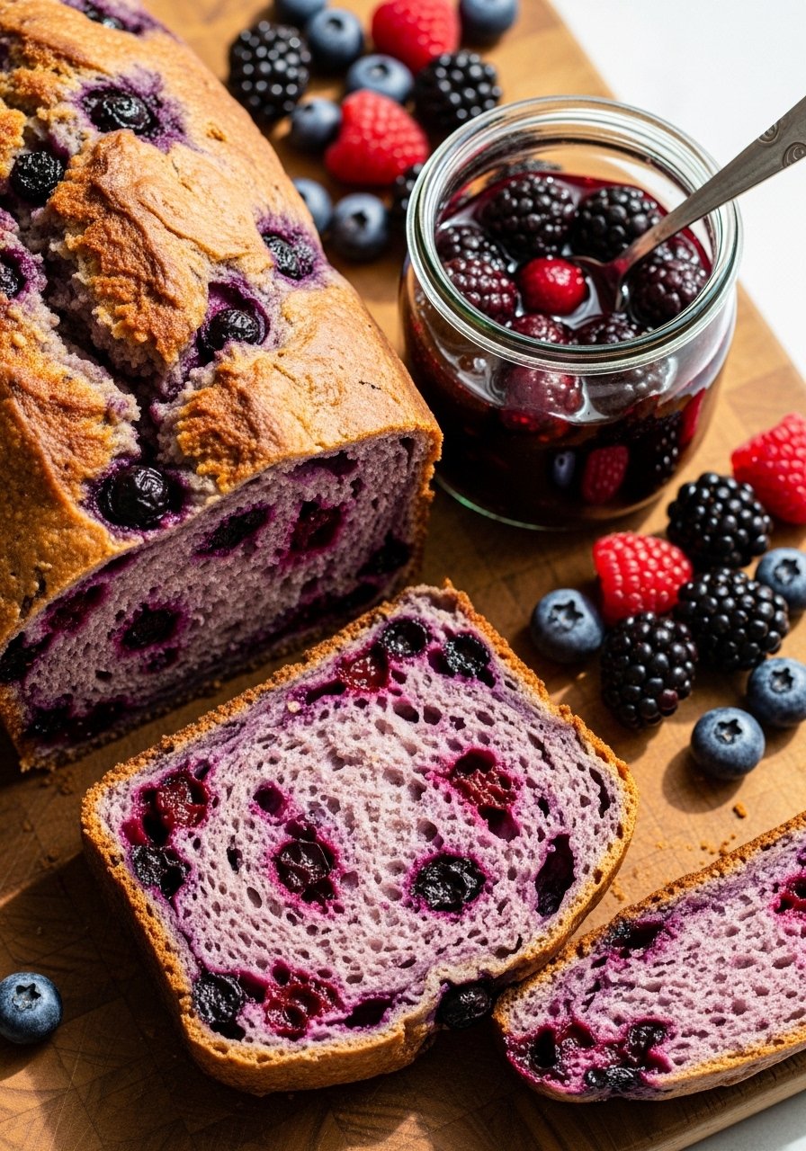 A mixed berry compote gives tart brightness and a pretty swirl inside the loaf. Use fresh or thawed frozen berries.