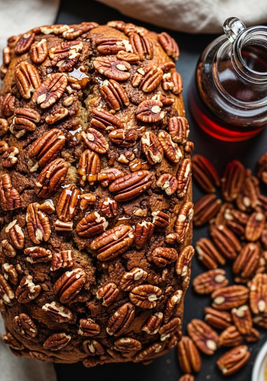 Maple syrup gives a deeper, woodsy sweetness that pairs beautifully with toasted pecans. This loaf has a crunchy top and soft interior.