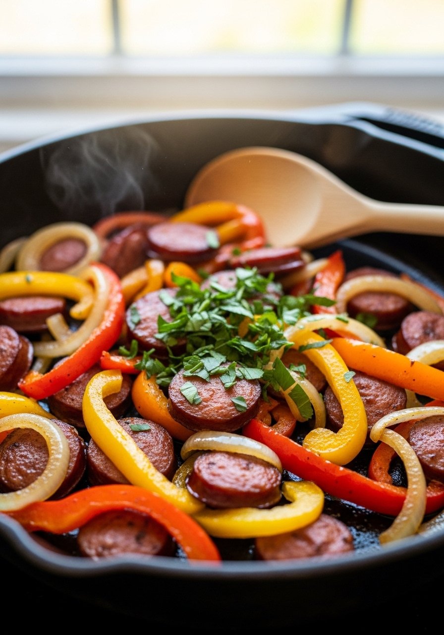A simple, colorful skillet dinner that's sweet, smoky, and slightly charred. The peppers caramelize while the pre-cooked smoked sausage browns, giving you contrast between crispy edges and tender veg. This feeds 4 easily and comes together in under 25 minutes—perfect for busy weeknights.