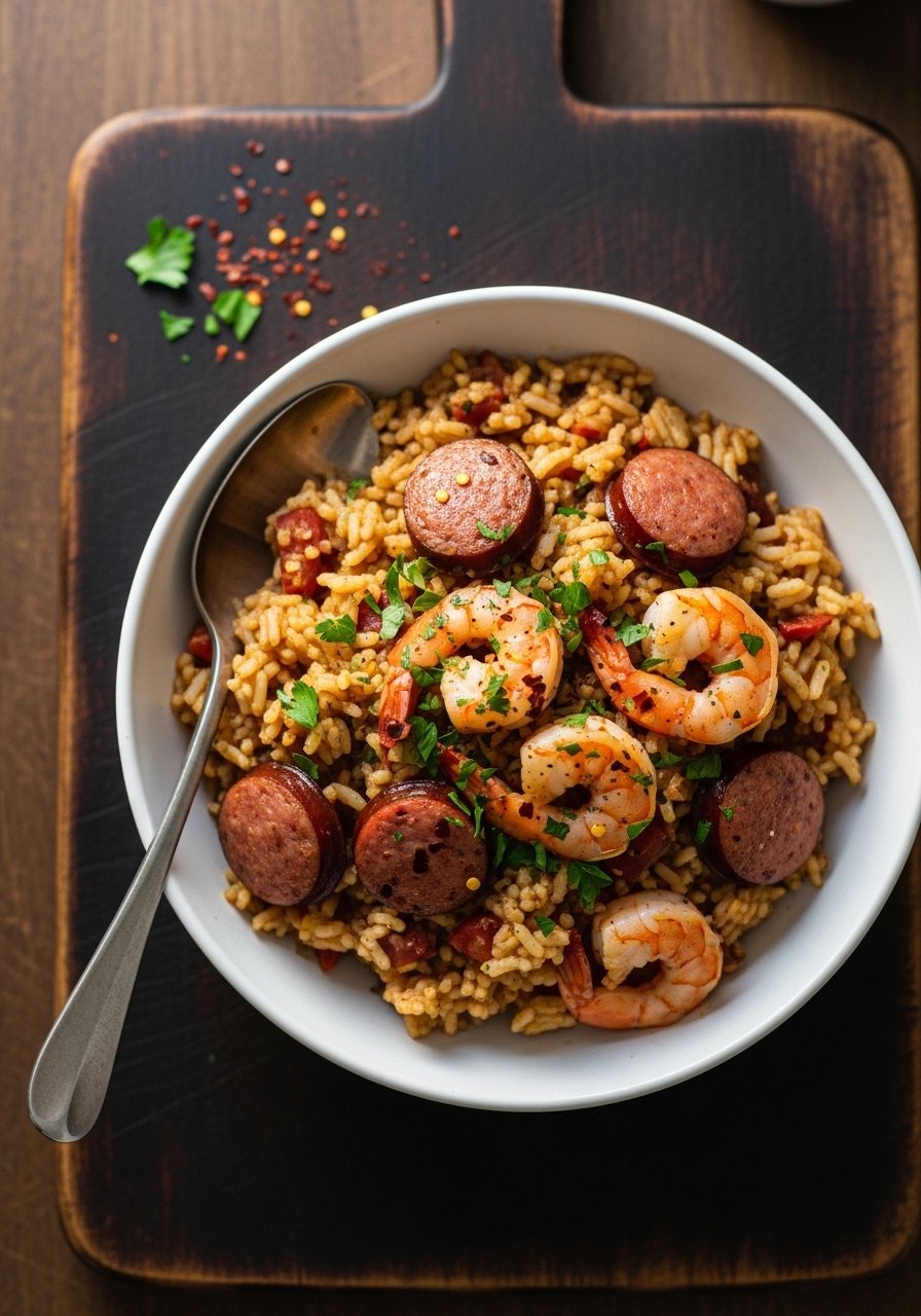 This budget-friendly jambalaya uses smoked sausage for instant smoky flavor and shrimps for a bit of luxury. It’s a lighter, quicker spin on the classic—one pot, minimal fuss, and big on comfort. Family-friendly with a little kick.