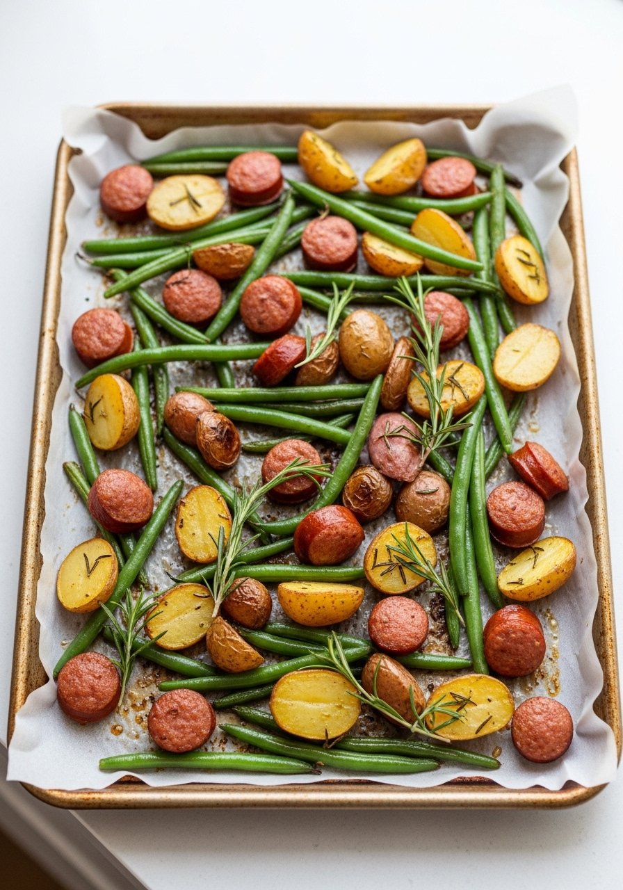 Sheet-pan dinners are the ultimate budget saver: minimal cleanup and everyone gets a full plate. Potatoes roast crispy while the smoked sausage caramelizes—green beans add freshness. Kid-friendly and easy to scale.