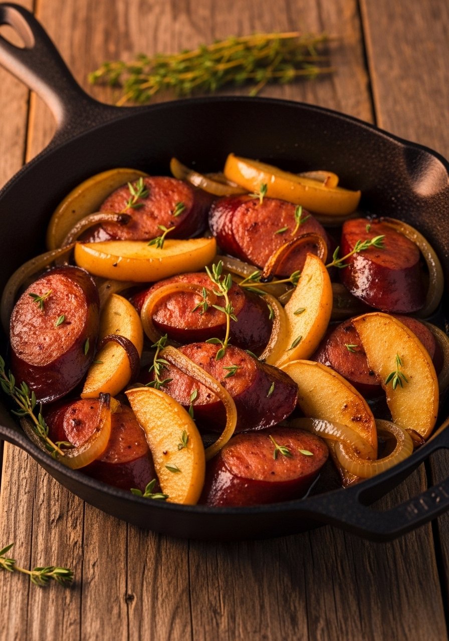 Sweet apples and smoky sausage are a perfect match—this skillet is quick, cozy, and unexpectedly elegant. The natural sugars in apples produce a glossy, slightly caramelized finish.