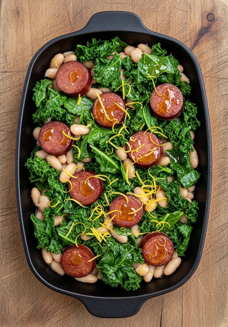Greens and beans make this a nutritious, low-cost dinner. Smoked sausage gives depth while hearty white beans make the meal satisfying and fiber-rich.