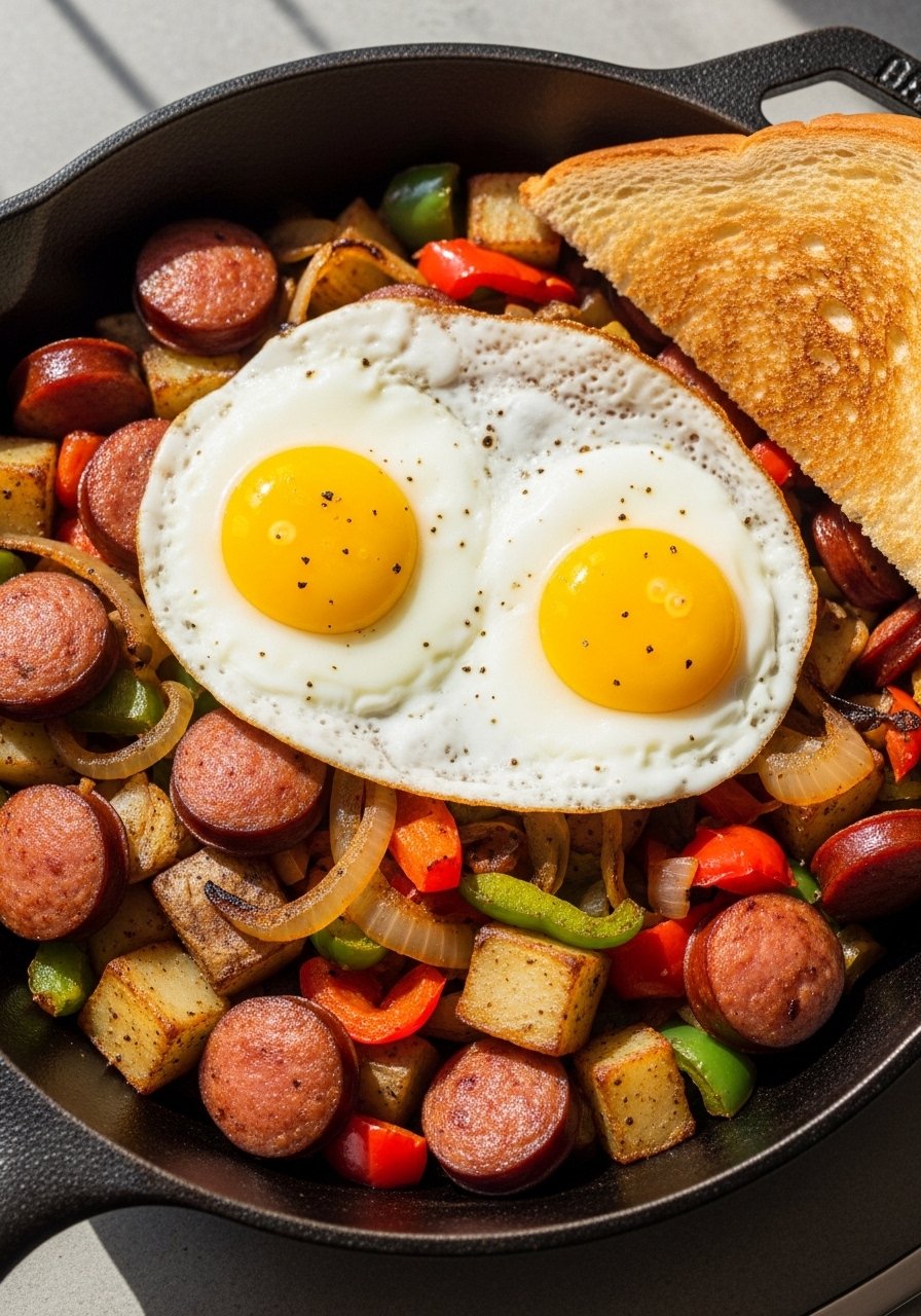 This hearty breakfast (or brunch) hash is a family favorite—crispy potatoes, smoky sausage, and runny eggs make a satisfying morning meal that’s cheap and easy to scale.