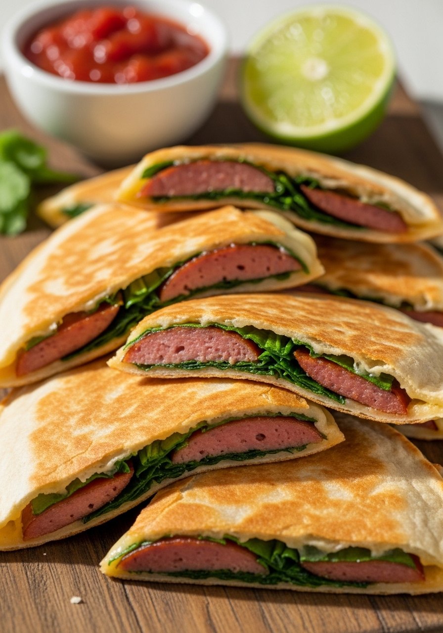 Quesadillas are fast, cheap, and endlessly customizable. Smoked sausage gives them a smoky kick, while spinach adds color and nutrition.