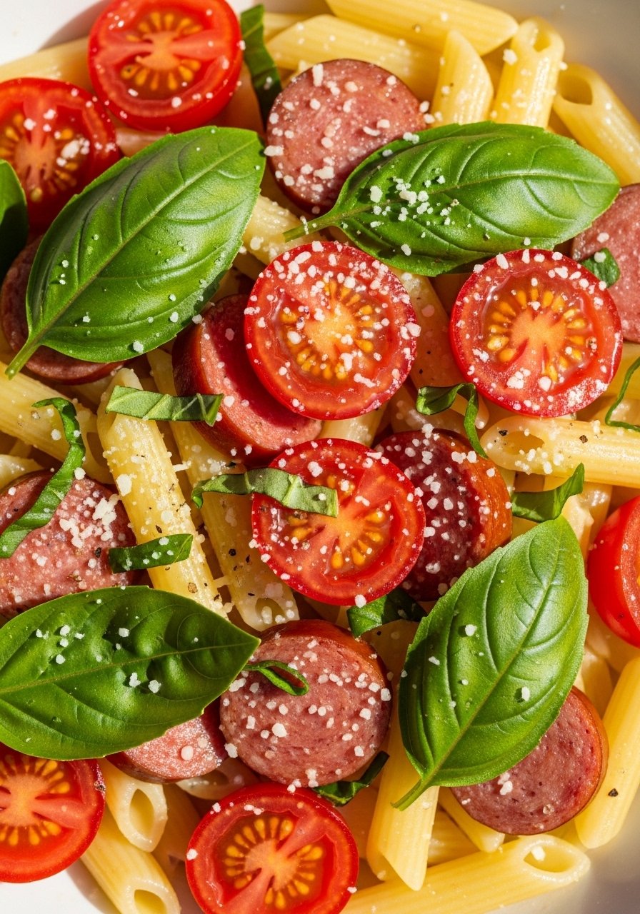 24. Sausage, Tomato & Basil Bruschetta Pasta (Budget-Friendly Entertaining)