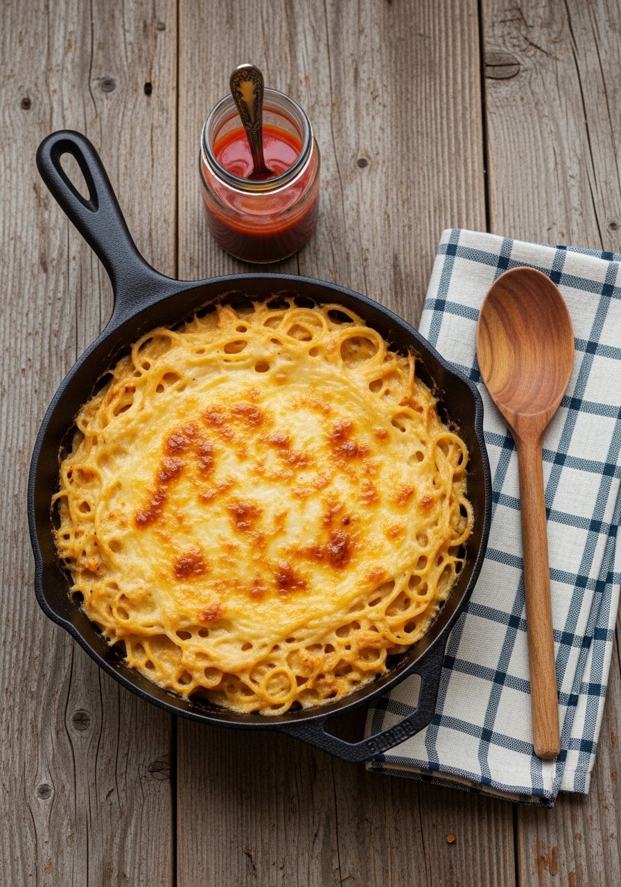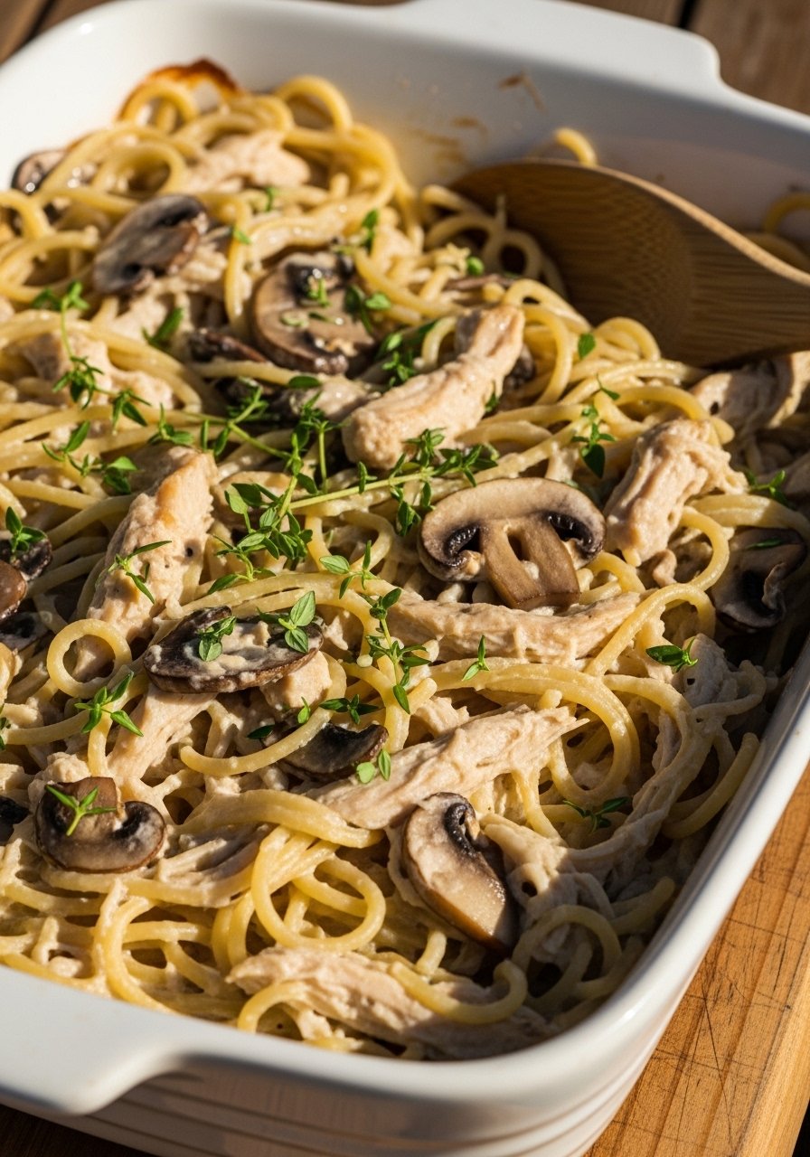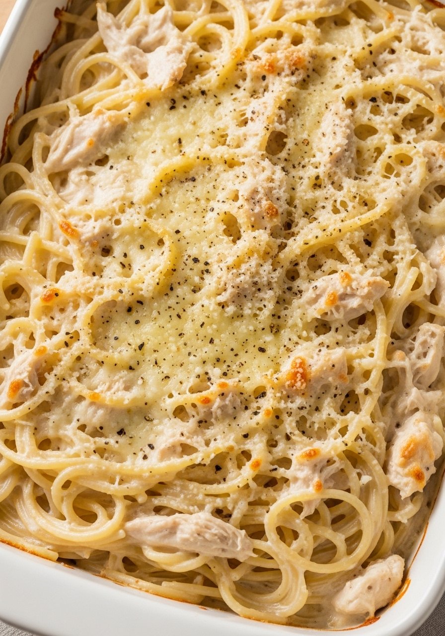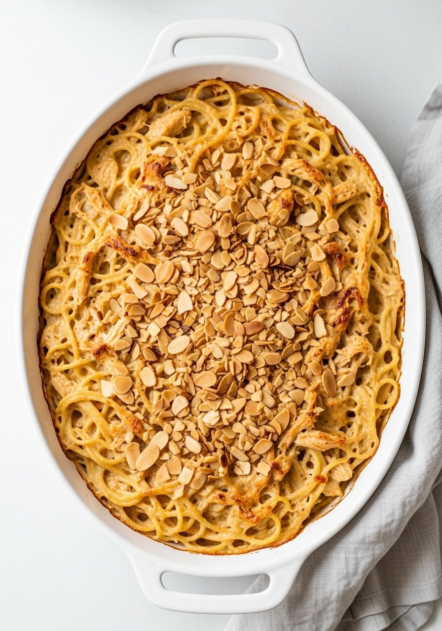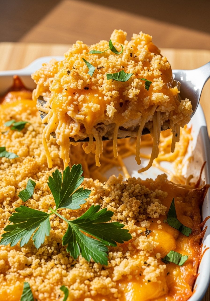 This is the cozy version you remember from potlucks: tender shredded chicken, spaghetti strands bathed in a creamy cheese sauce, and a golden, crispy top. The texture is creamy with crunchy edges and a buttery breadcrumb finish. It's an easy crowd-pleaser for weeknights and Sunday dinners. Home cooks who like simple, nostalgic flavors will love this one.