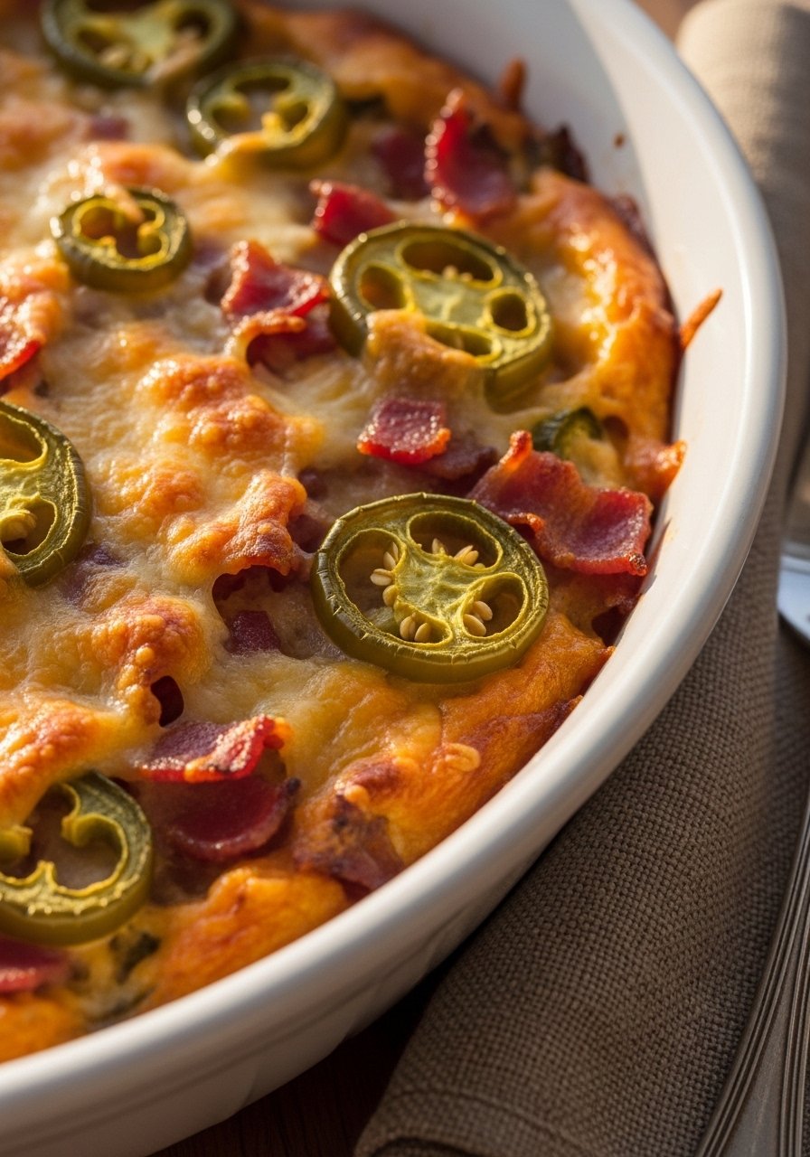 This playful casserole borrows from jalapeño poppers—cream cheese, jalapeños, and bacon—giving you spicy, creamy, crunchy bites in every scoop. Great for parties and anyone who likes a little heat.