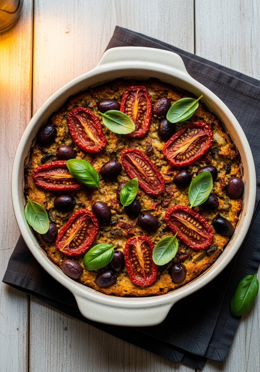 Sun-dried tomatoes and olives add sweet-tart and briny notes to this casserole. The flavors are robust and aromatic—great for folks who enjoy Mediterranean accents in comfort dishes.