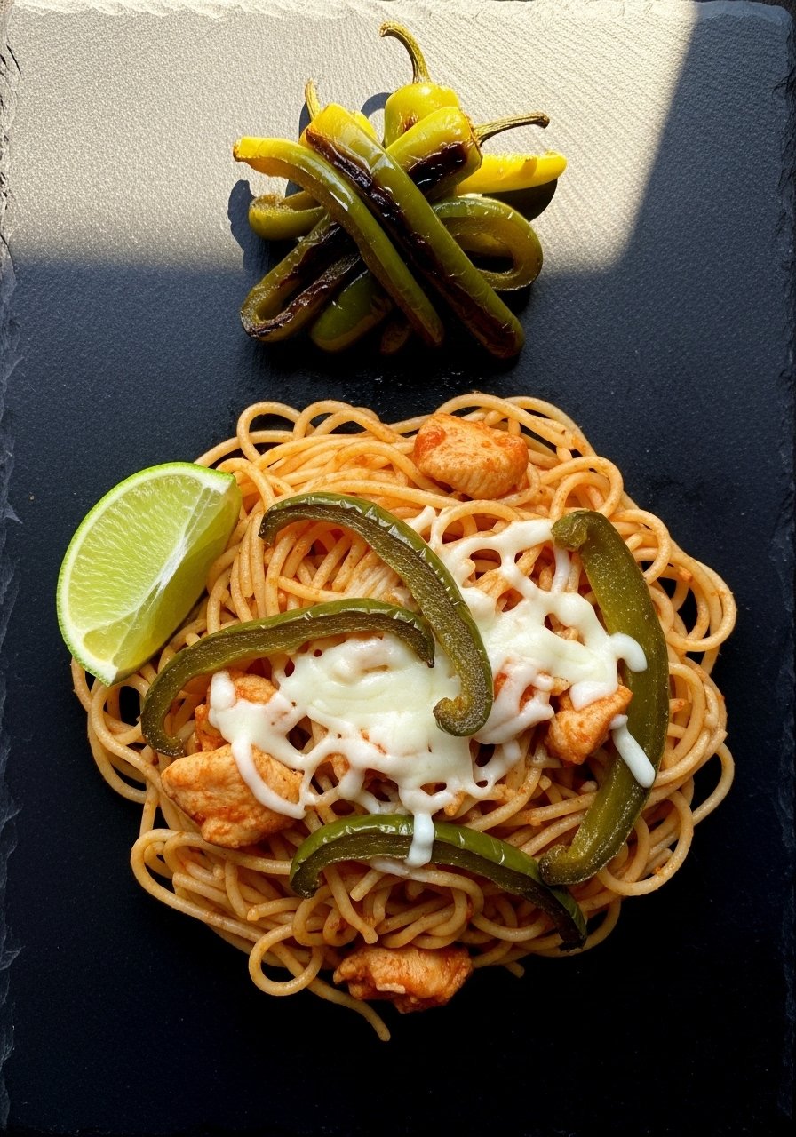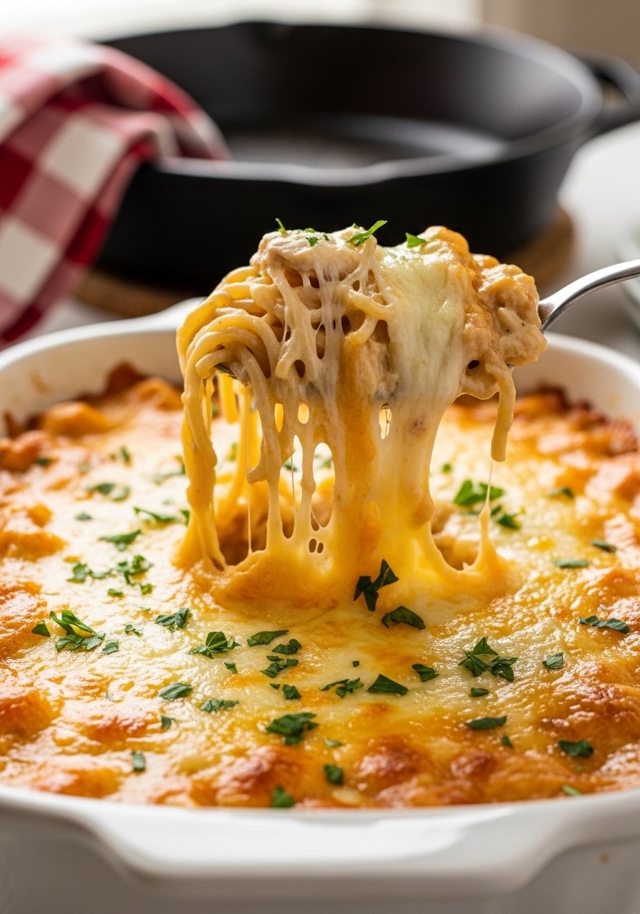 This is the cozy original: shredded chicken, spaghetti, Velveeta-style creaminess, and Rotel for brightness and heat. It’s creamy, tangy, and perfect for family dinners. The texture is silky with crisped cheese edges that smell irresistible.