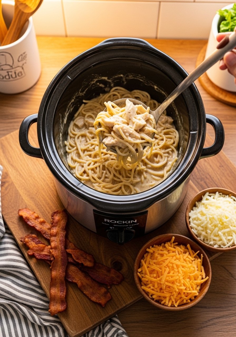 Let the slow cooker do the heavy lifting. This version blends gentle heat, smoky bacon, and Rotel’s bright bite for hands-off comfort. The sauce develops deep flavor while you go about your day, and the bacon adds irresistible crunch.