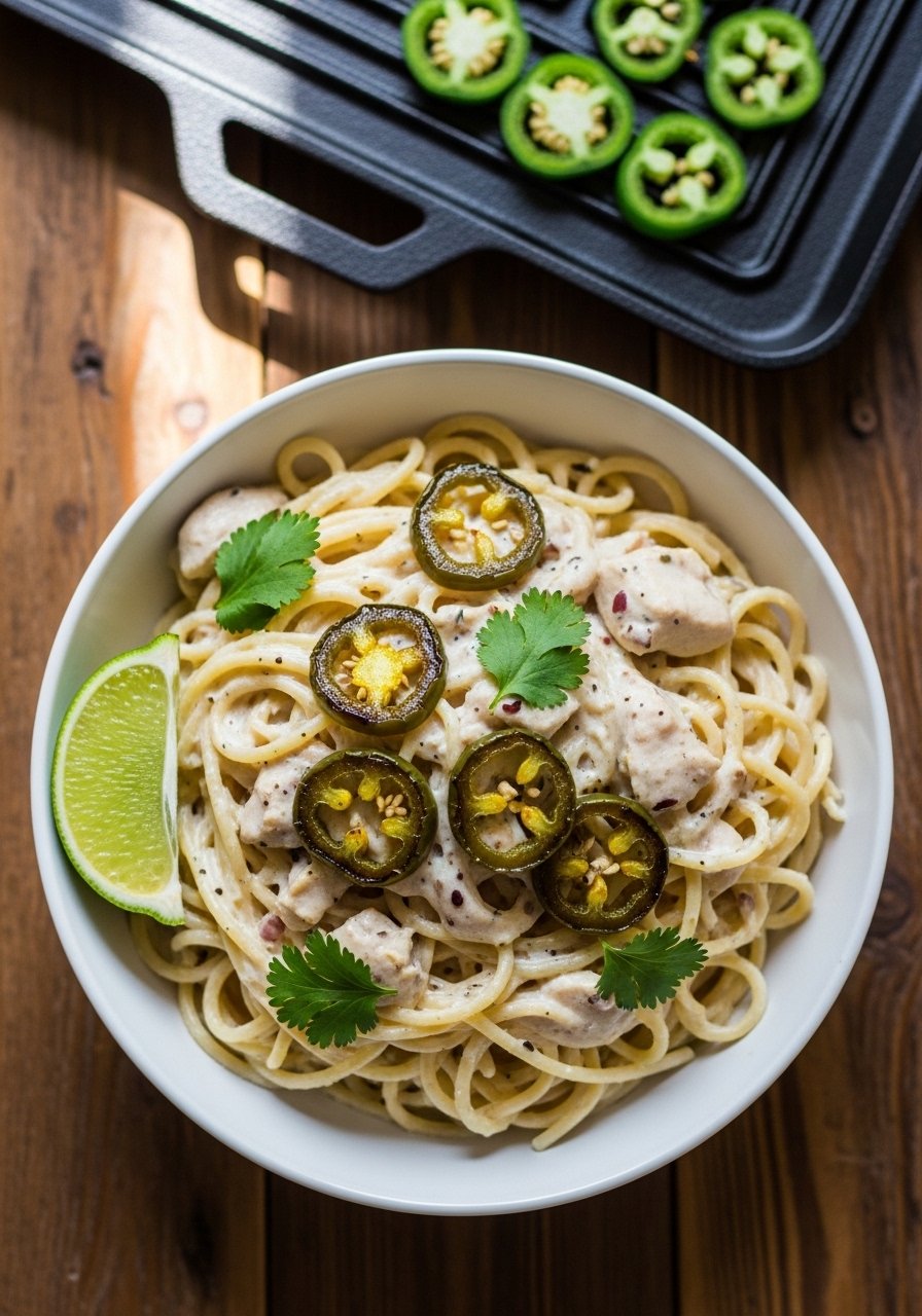 This one leans into green heat: roasted jalapeños and Rotel create a lively, smoky spice. The cream cheese base softens the heat into a lush, silky sauce. Fans of medium-spicy dishes will adore the pop of citrus at the end.