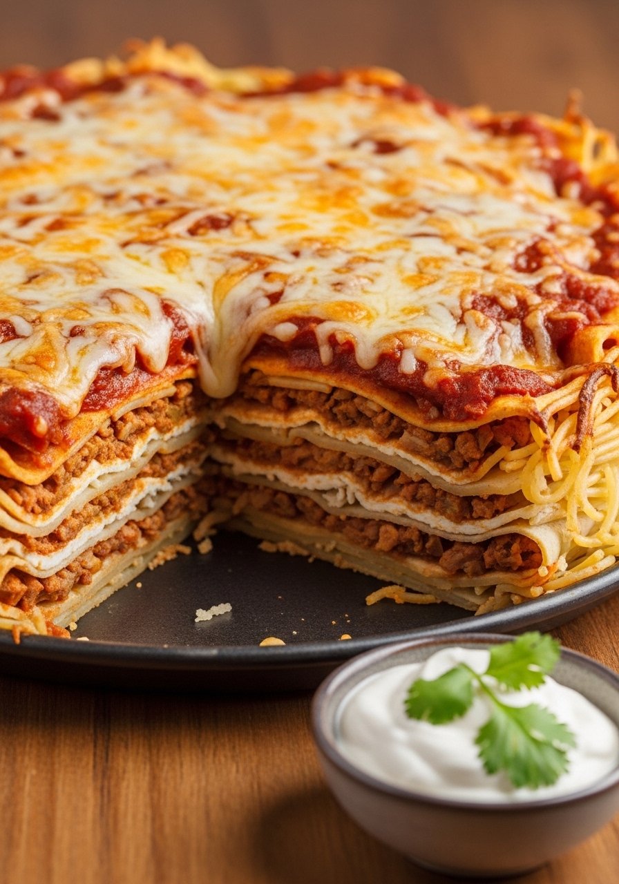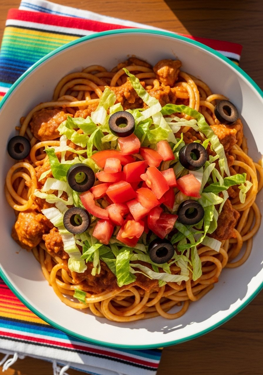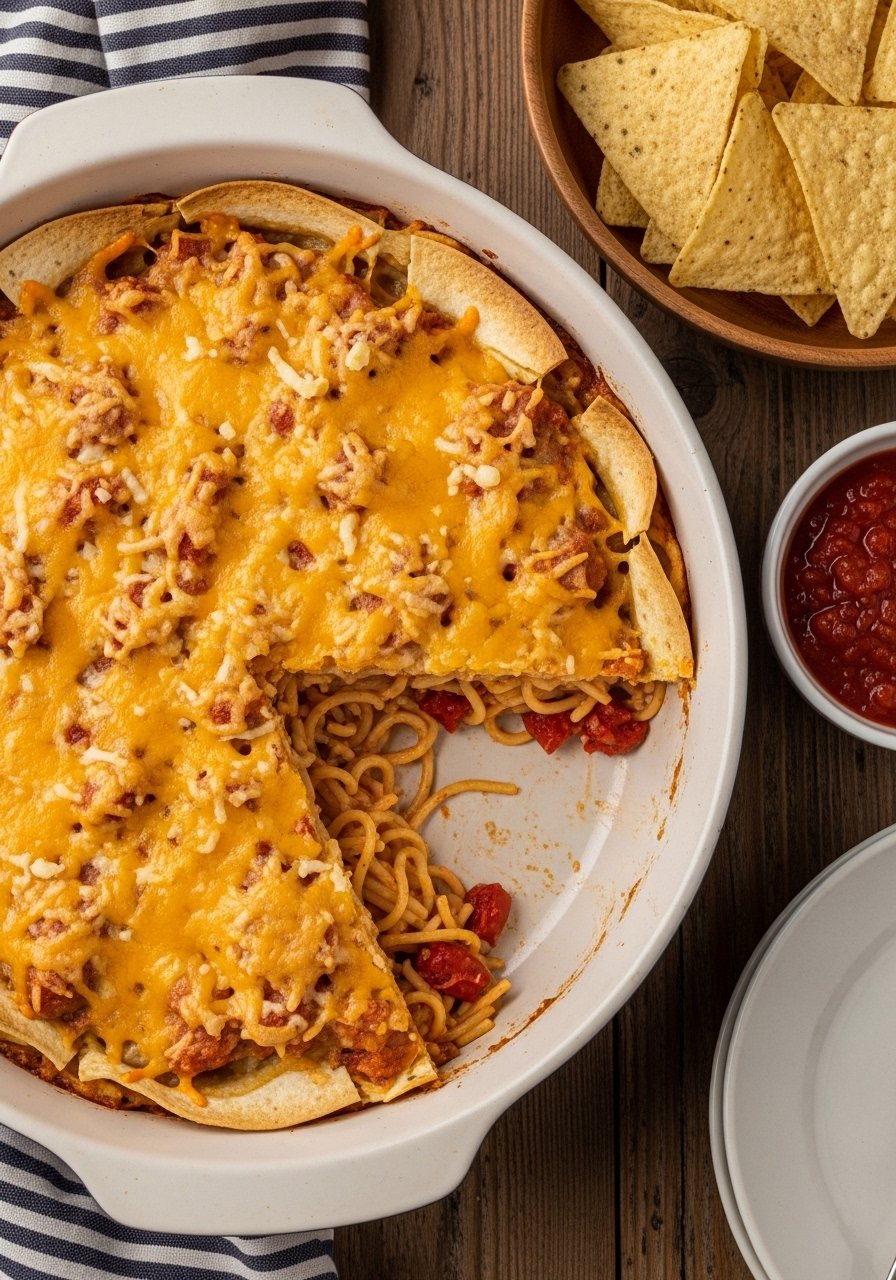 This playful casserole tops chicken spaghetti with crushed tortilla chips and cheese for an addictive crunch. It's like nachos met spaghetti—comforting, crunchy, and full of flavor.