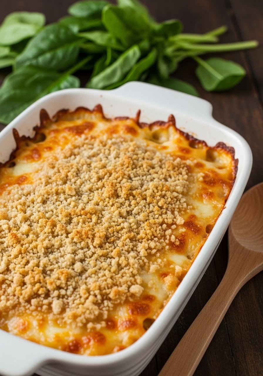 This casserole tucks extra spinach into the chicken mixture and finishes with a fragrant herb crust. It looks impressive but is simple to assemble—great for family dinners.