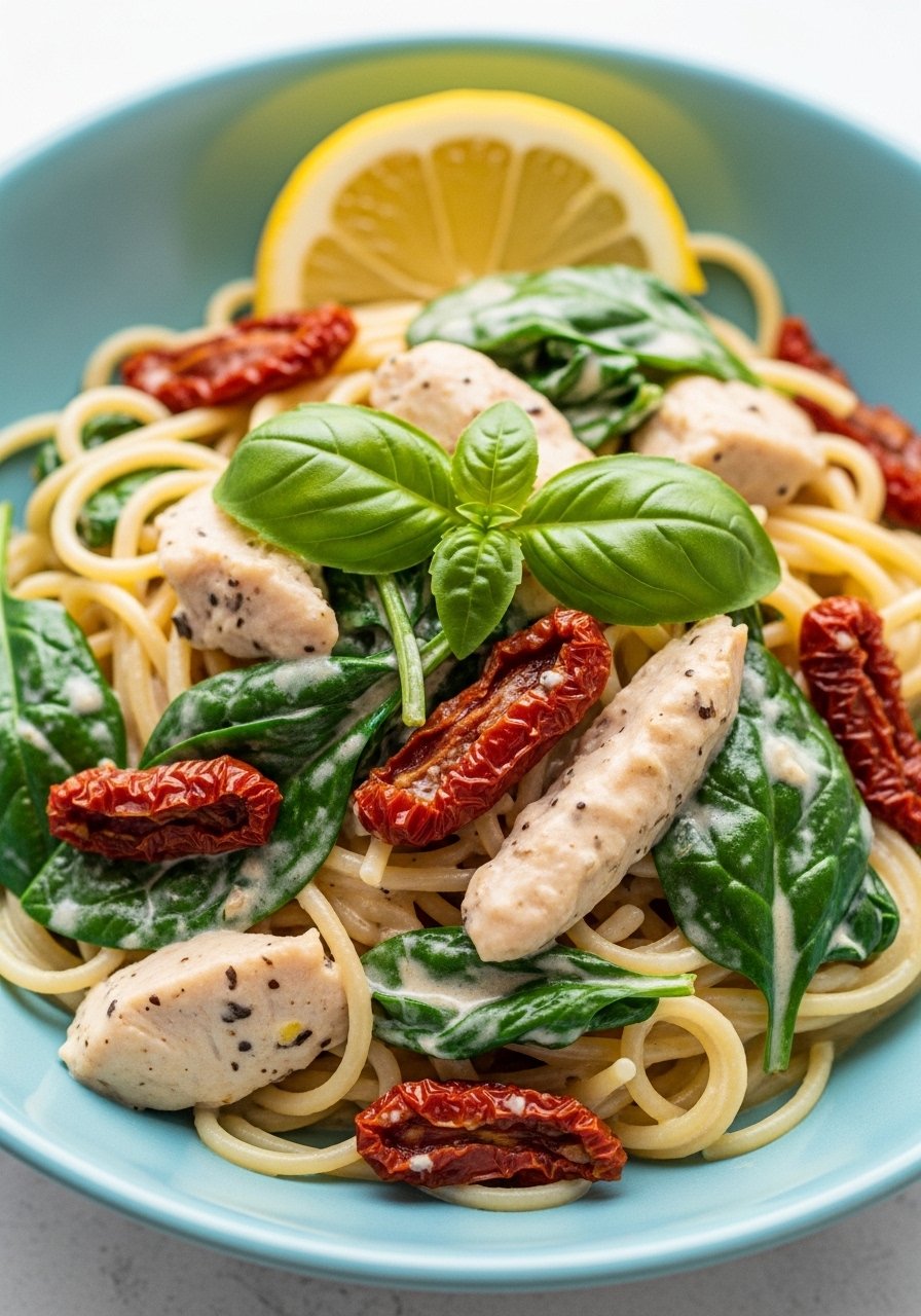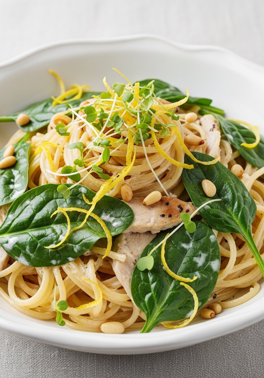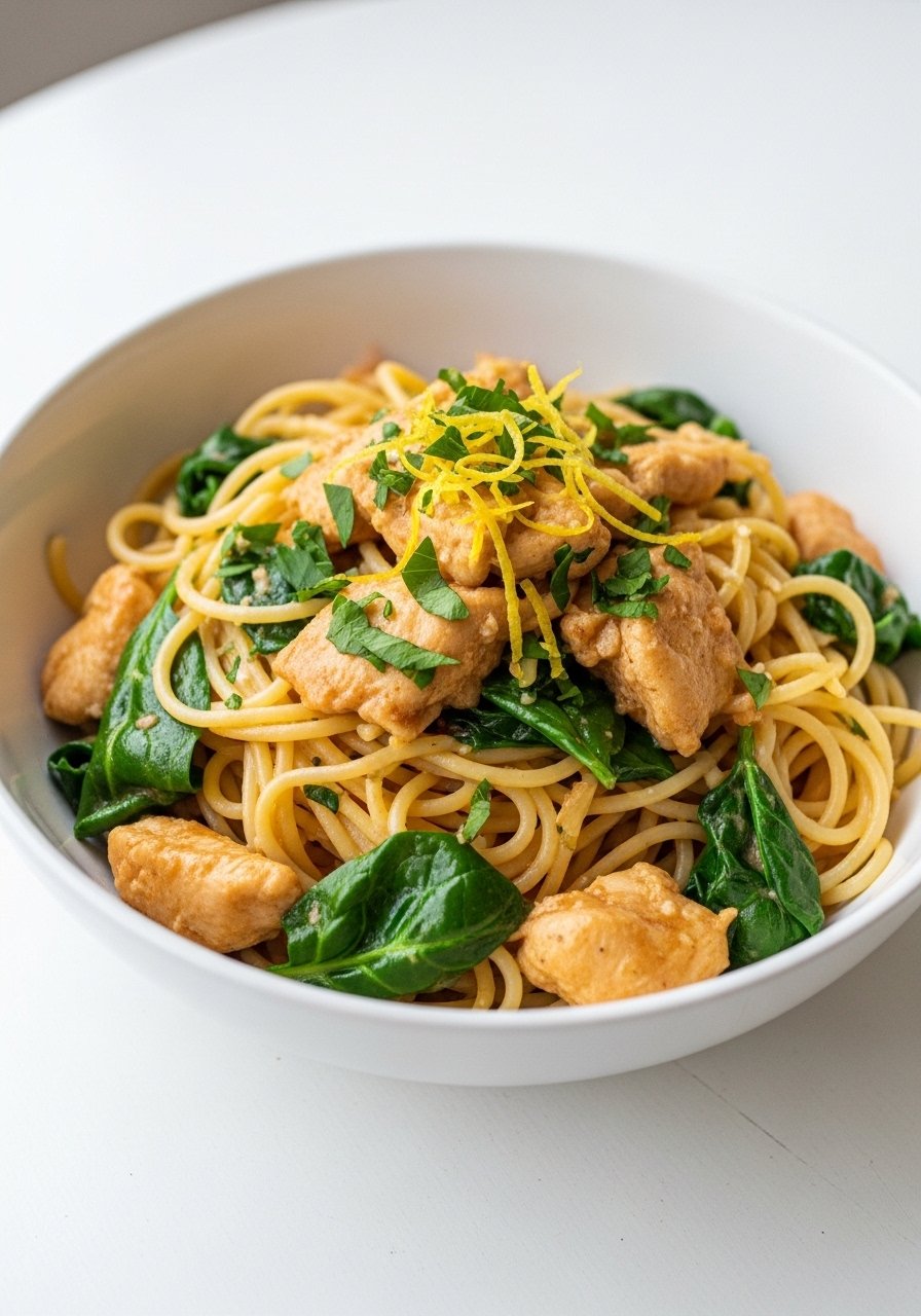 This is the cozy, tried-and-true version: creamy sauce, tender shredded chicken, and wilted spinach folded into spaghetti. It’s silky, garlic-forward, and crowd-pleasing—perfect for weeknights or potlucks. The texture is rich but balanced by the pop of green and a squeeze of lemon if you like brightness.