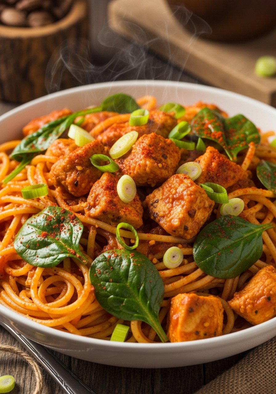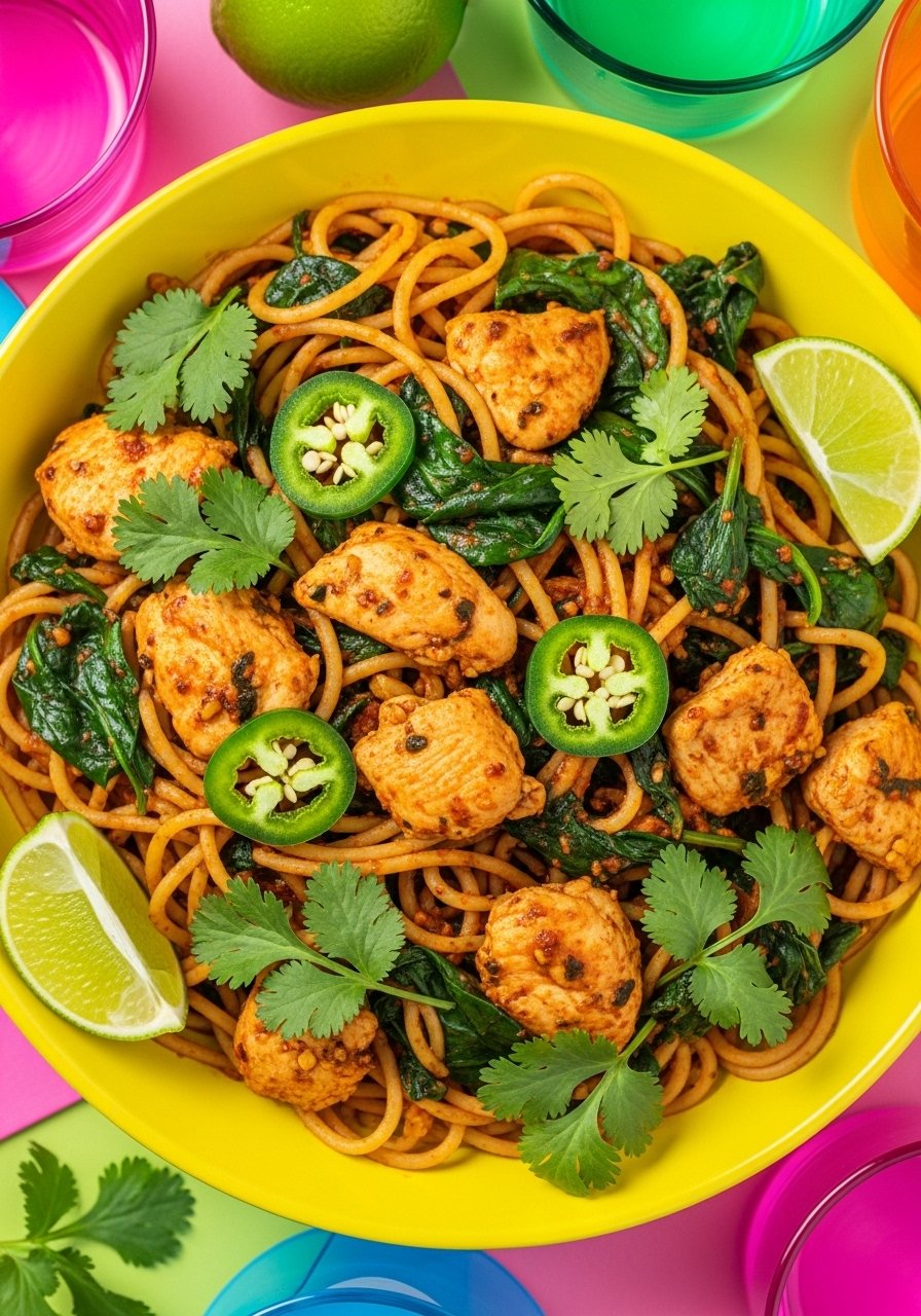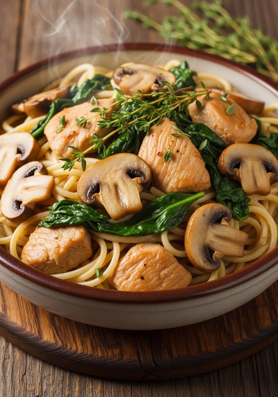 This is the cozy, tried-and-true version: creamy sauce, tender shredded chicken, and wilted spinach folded into spaghetti. It’s silky, garlic-forward, and crowd-pleasing—perfect for weeknights or potlucks. The texture is rich but balanced by the pop of green and a squeeze of lemon if you like brightness.