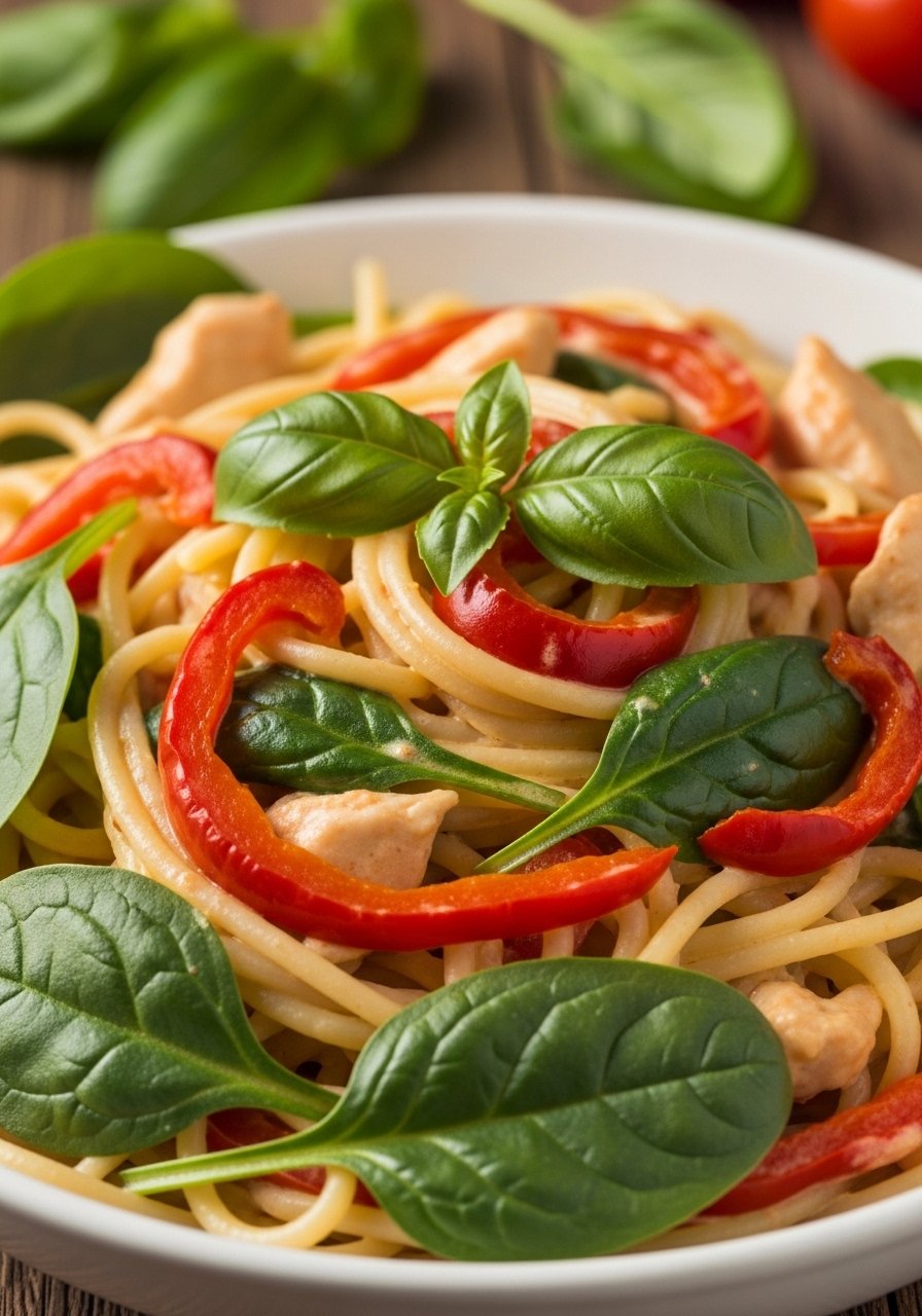 16. Creamy Roasted Red Pepper Chicken Spaghetti with Spinach
