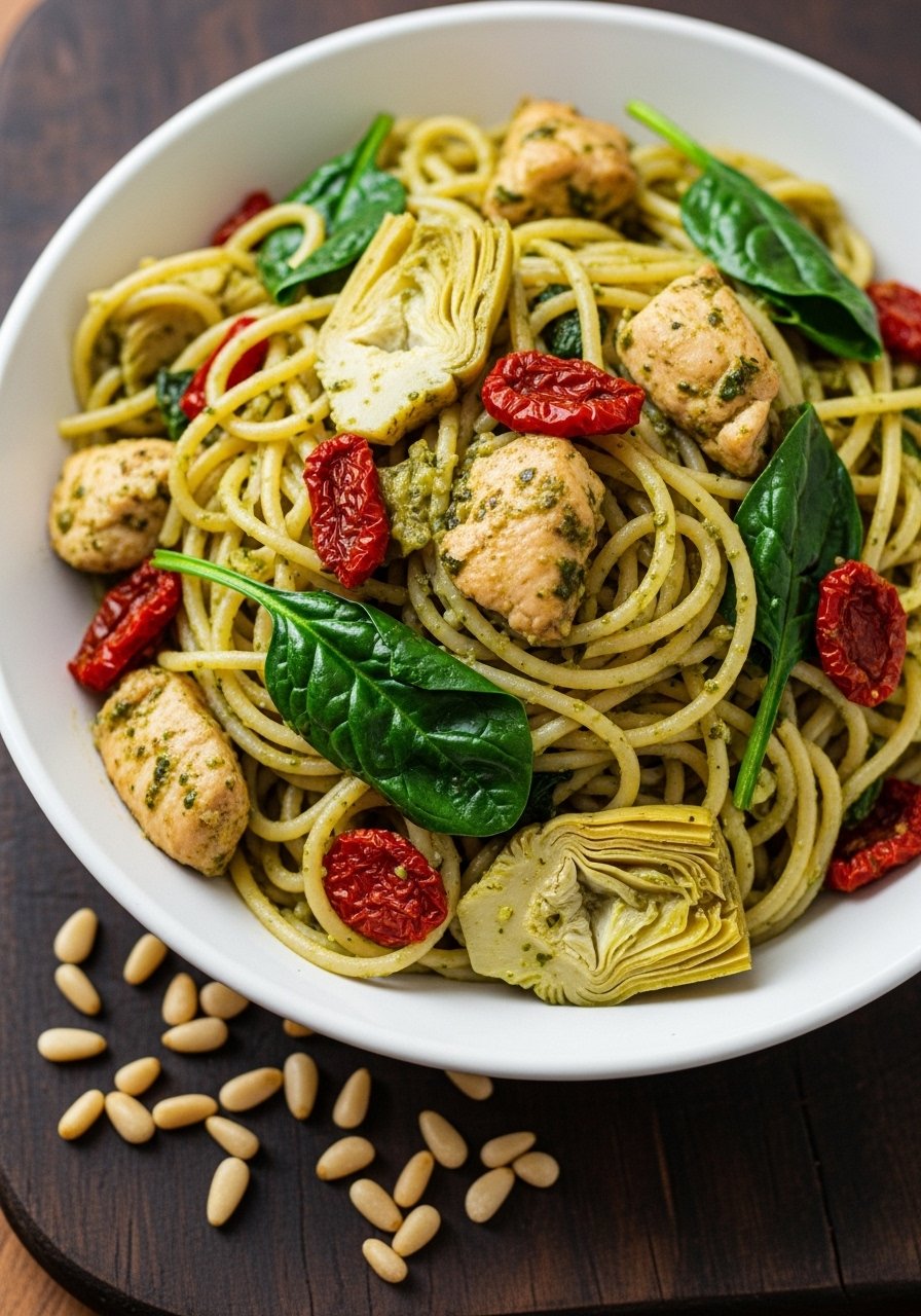 17. Sundried Pesto Chicken Spaghetti with Spinach and Artichoke