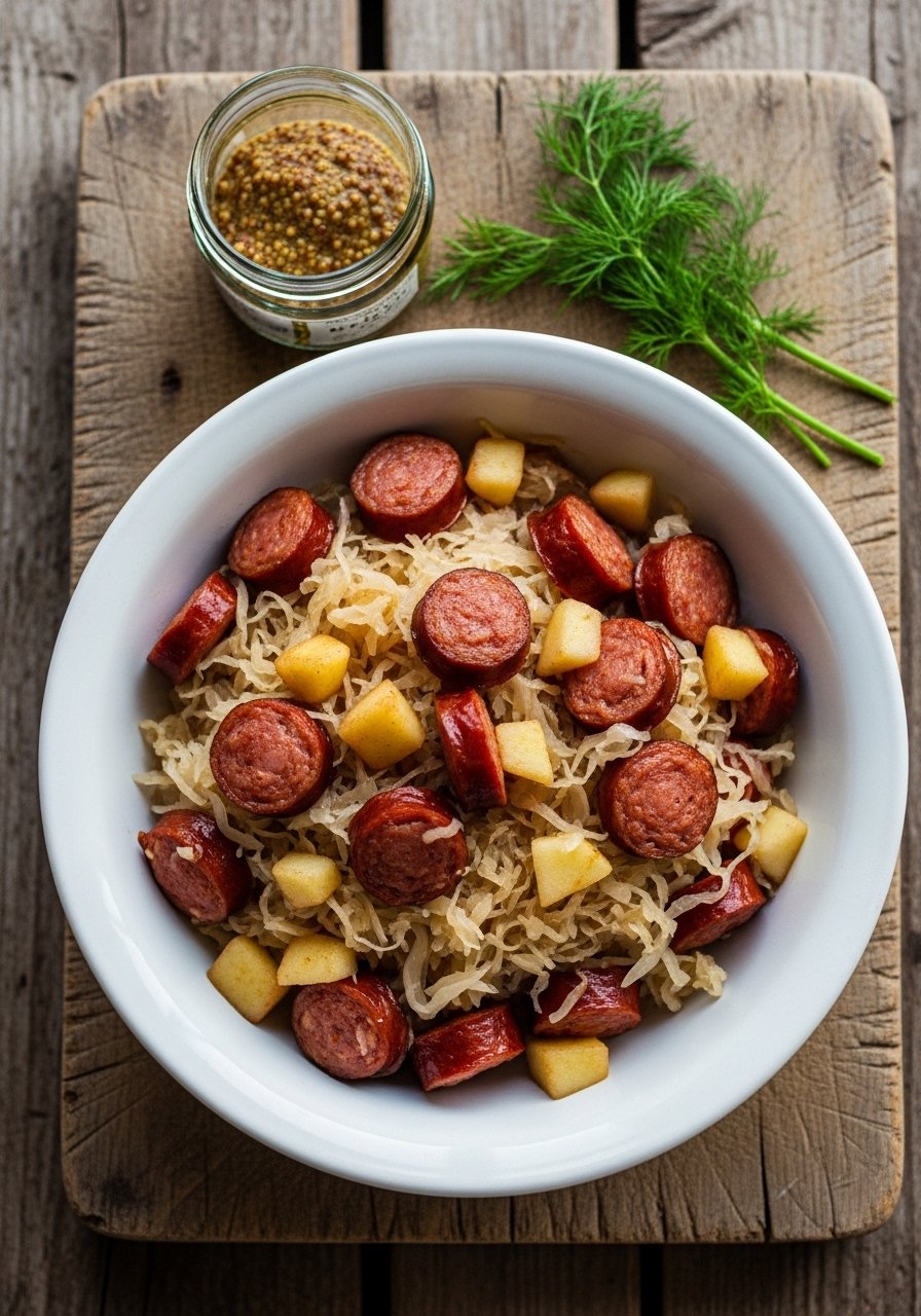This German-inspired combo turns tangy sauerkraut and sweet apple into a cozy duo with smoky kielbasa. The slow cooker softens the apples and mellows the kraut for a balanced plate. Ideal for cold nights or casual family dinners.