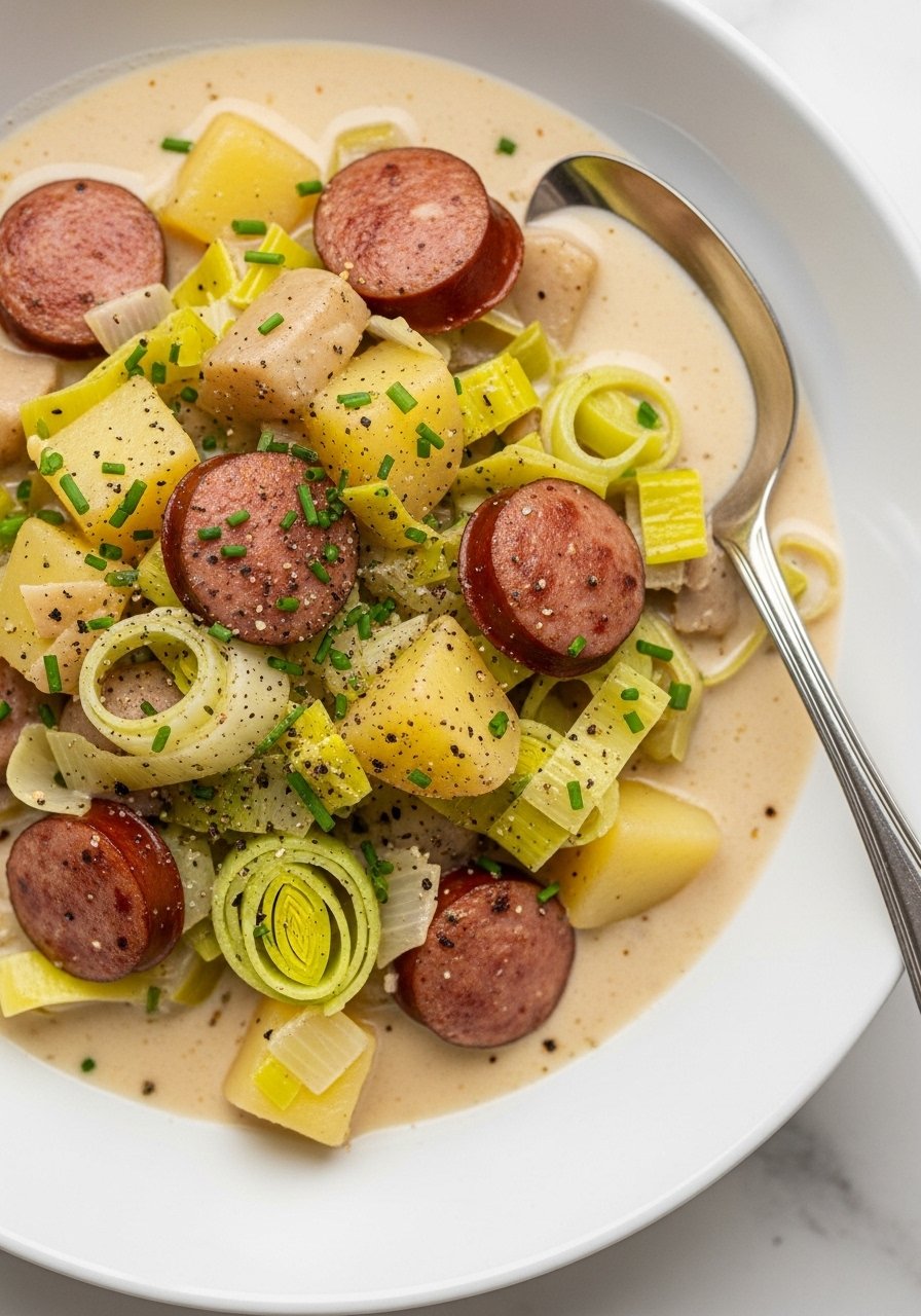 A silky stew where potatoes break down slightly to thicken the broth, while leeks add a delicate onion flavor. Smoked sausage gives salty richness. This recipe is forgiving—great when you want comfort and easy cleanup.