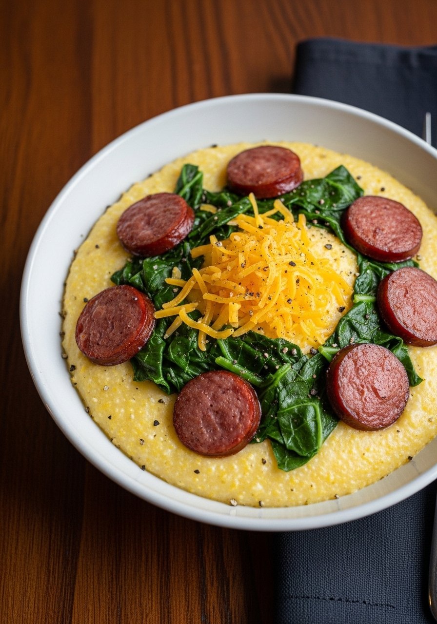 6. Cheesy Grits with Smoked Sausage and Greens
