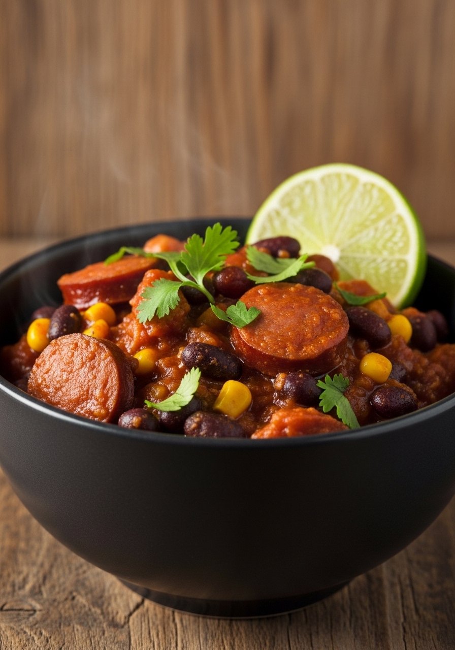 This stew is robust and flavorful; swap in a plant-based smoked sausage for a vegan option. Chickpeas add body while tomatoes and smoked spices create depth.