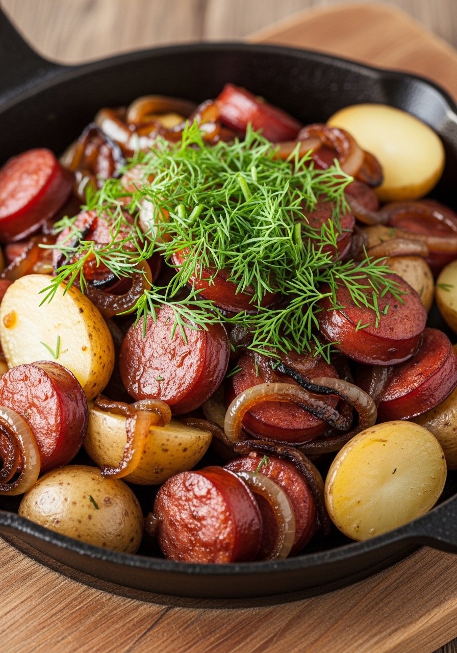 This simple German-style dish mixes baby potatoes and sausage with savory onions for a filling, rustic meal. Potatoes roast to tender perfection while sausage flavors the whole pot.