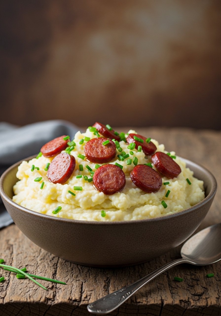 This keto-friendly swap uses cauliflower mash instead of potatoes, while smoked sausage brings the savory punch. It’s creamy, low-carb comfort that reheats well.