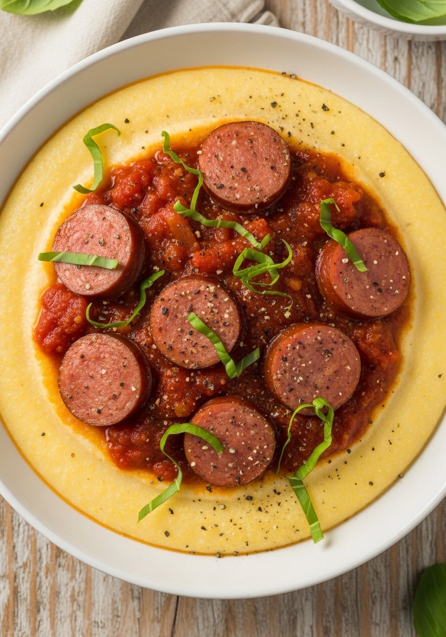 A creamy polenta base gets spooned with a chunky sausage and tomato ragout that simmers slowly until flavors are deep and cohesive. This is an elegant but easy comfort plate.