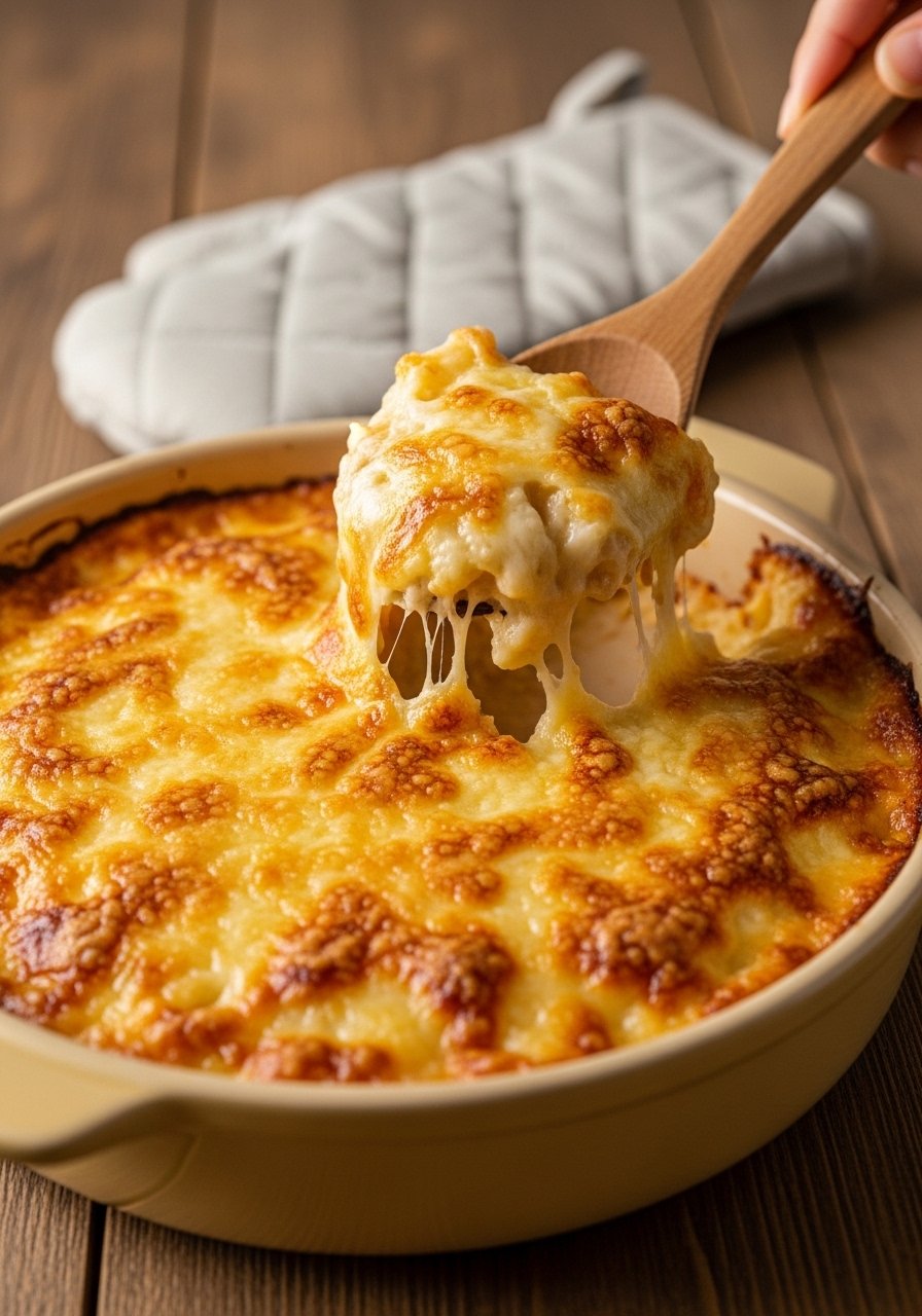 This shortcut casserole gives you a baked topping without long prep—mix, top, and broil for crispy edges. The texture combines creamy interior with cheddar crisp on top. Perfect for potlucks or making ahead.