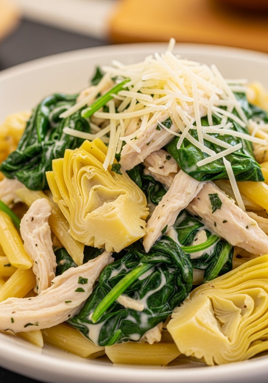 5. Add spinach, artichokes, chicken, and spaghetti; toss.