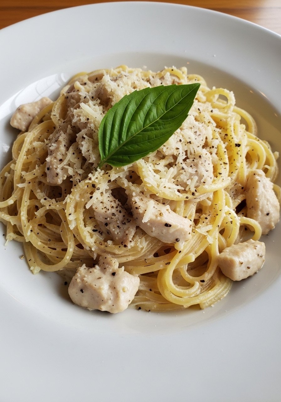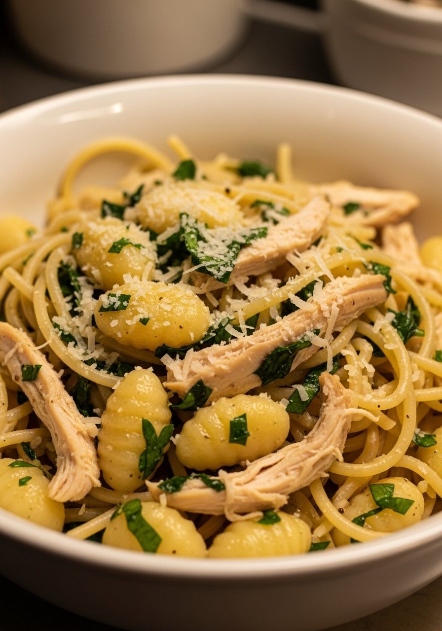 5. Add shredded chicken and spaghetti; toss, adding reserved pasta water if needed to loosen.