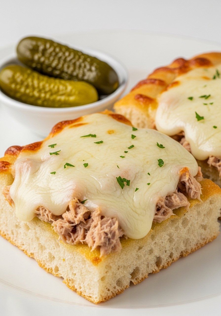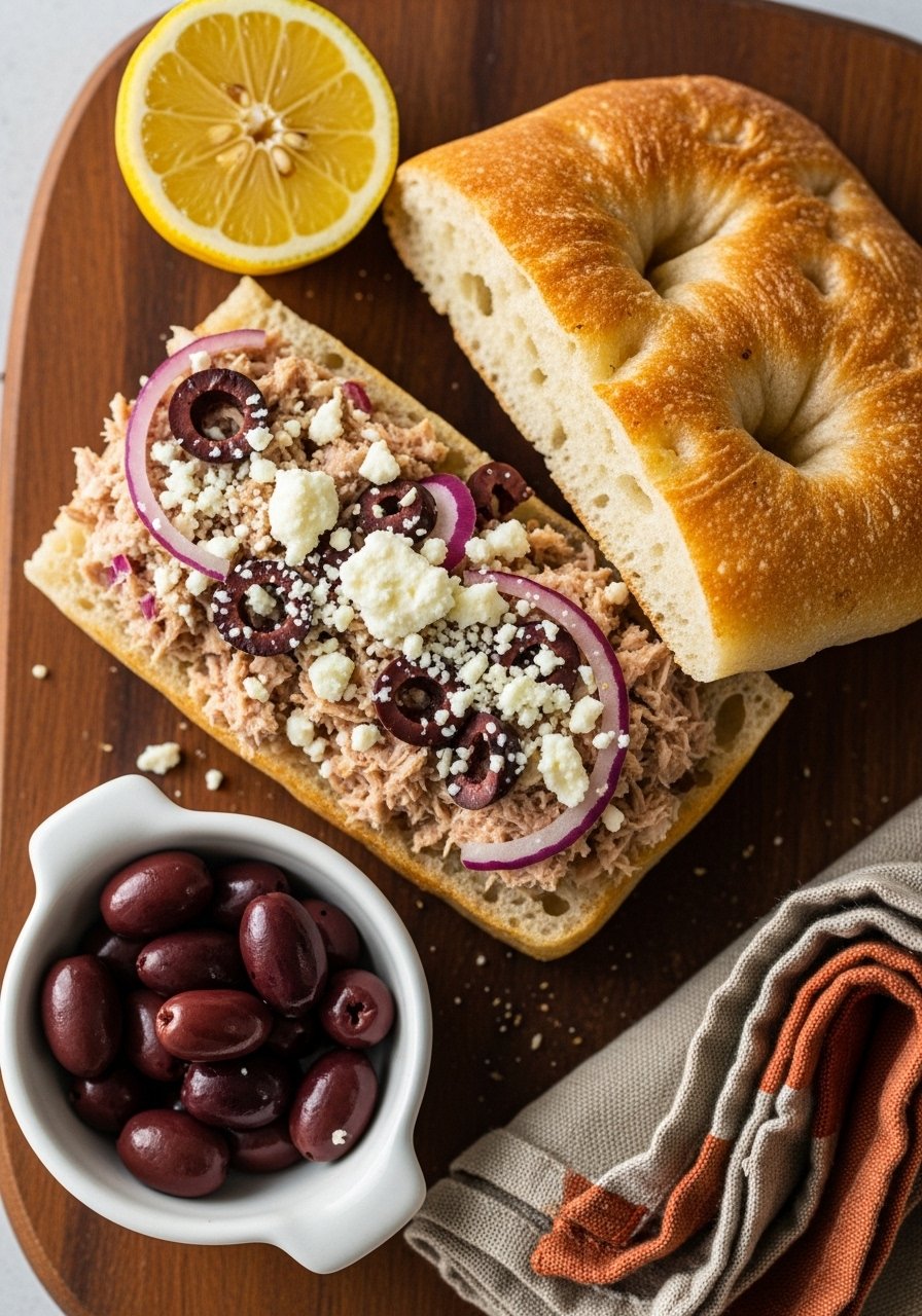 This tuna melt leans Mediterranean—briny olives and tangy feta lift the tuna into something bright and savory. Toasting briefly makes the focaccia edges golden while the center stays tender. Great for picnic boxes or quick weeknight dinners.