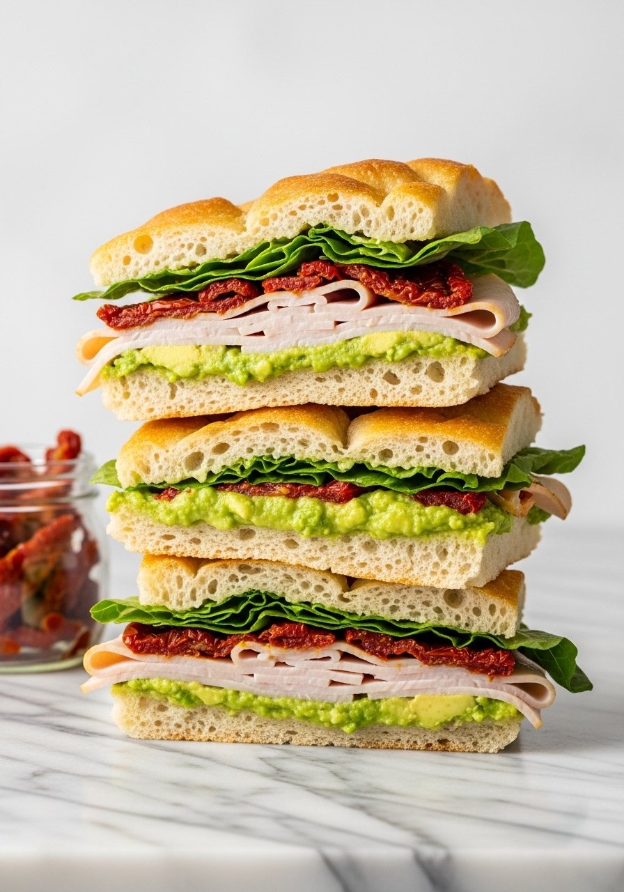 Creamy avocado and tangy sun-dried tomatoes make this turkey sandwich feel fancy but stays easy. The focaccia adds olive-oil flavor and a chewy crumb that pairs with sliced turkey for a balanced mouthfeel.
