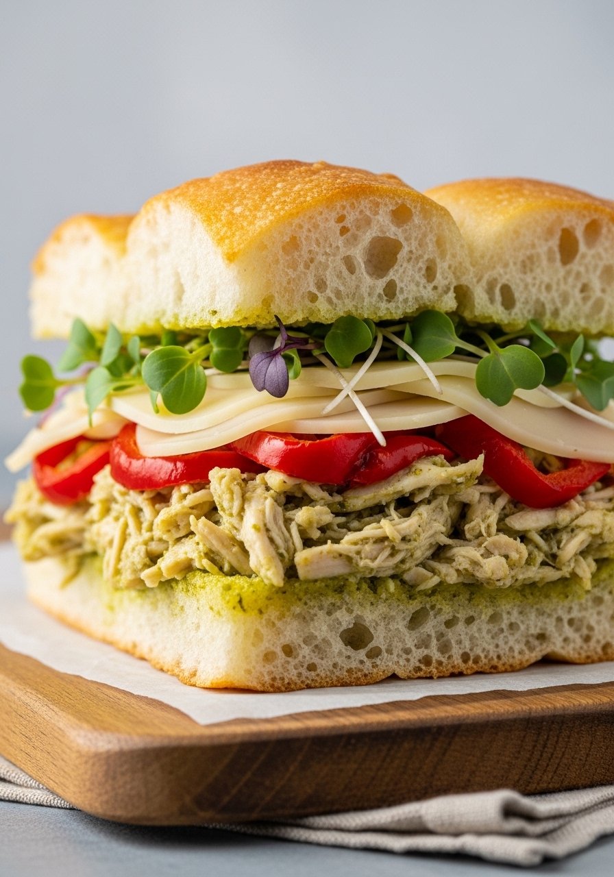Shredded chicken tossed in pesto plus sweet roasted peppers yields a Mediterranean-leaning sandwich full of herbaceous flavor. Toasted focaccia gives a crisp exterior and warm, melty center.