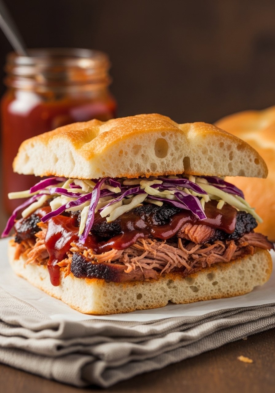- Spread pork on bottom focaccia, top with coleslaw and pickled onions.