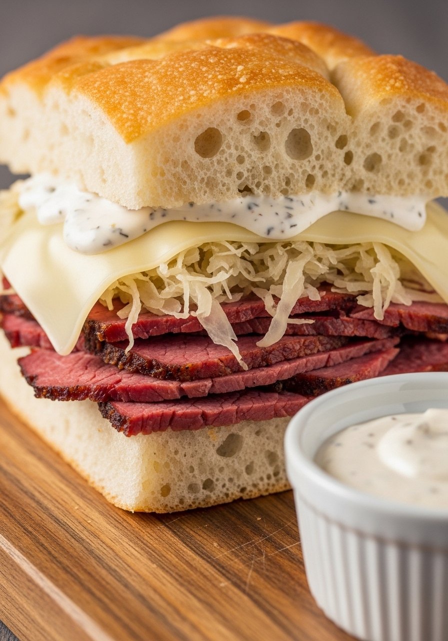 - Spread dressing on focaccia and layer corned beef, sauerkraut, and Swiss.