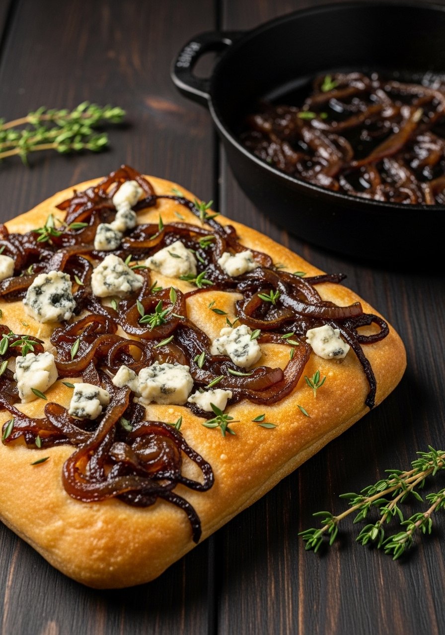 Sweet, slow-cooked onions and tangy gorgonzola make this a rich, savory focaccia perfect for brunch or a cheese board. The thyme adds an earthy lift to the melty cheese. If you caramelize onions in a cast iron skillet, they develop deep flavor fast.