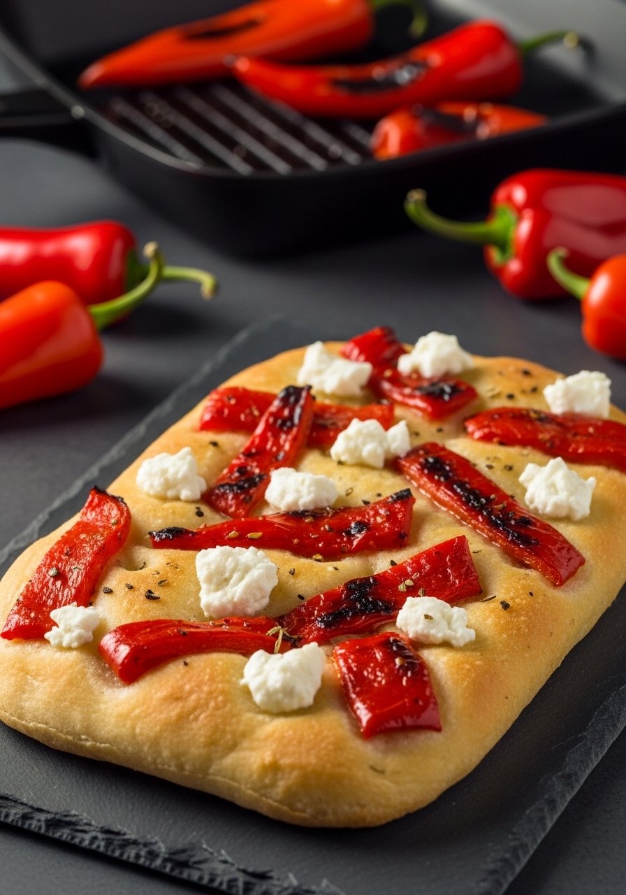 Smoky charred peppers and tangy goat cheese create a vibrant, slightly sweet-and-smoky loaf. Char peppers on a grill pan for quick charring.