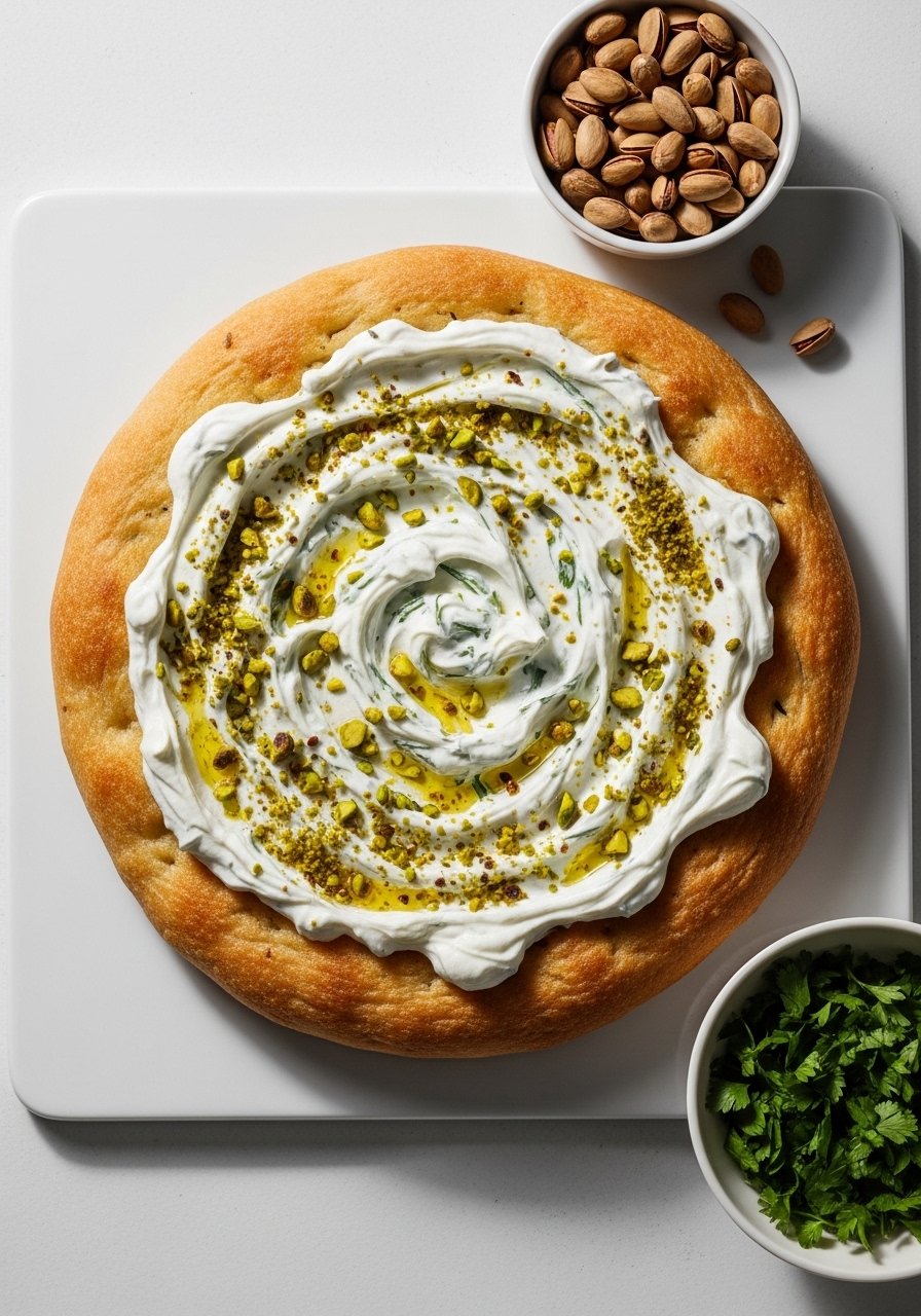 Herbed labneh swirled into warm focaccia and topped with pistachios gives creamy, tangy, and crunchy contrasts. It’s bright, slightly nutty, and great with roast vegetables. Use a small spoon or palette knife to swirl labneh.