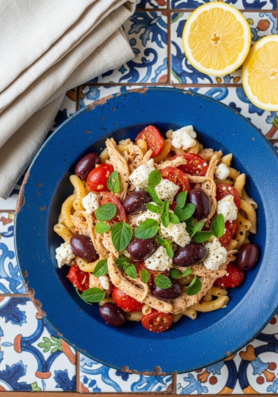 Olives, feta, and oregano bring salty, briny pleasure to a light chicken spaghetti base. This dish feels like a Mediterranean escape with tomatoes and lemon brightening every bite. Prep time: 12 minutes | Cook time: 18 minutes | Serves 4.