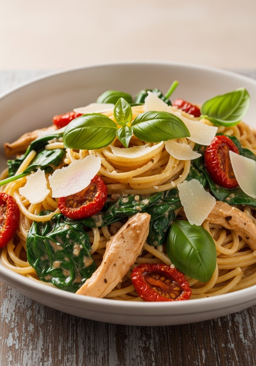 13. Creamy Sundried Tomato & Spinach Chicken Spaghetti