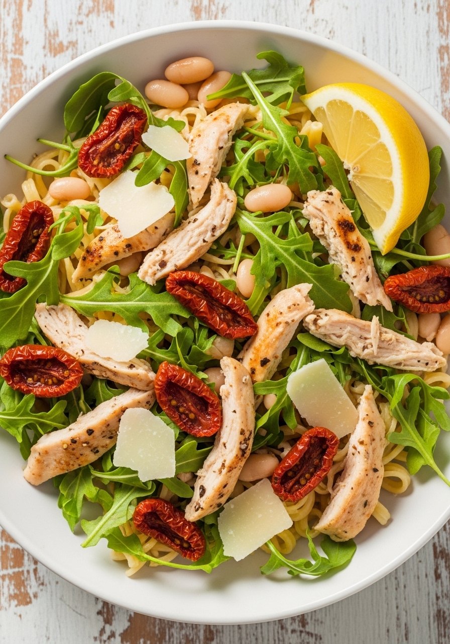 - Toss spaghetti with olive oil, lemon juice, beans, sun-dried tomatoes, and chicken.