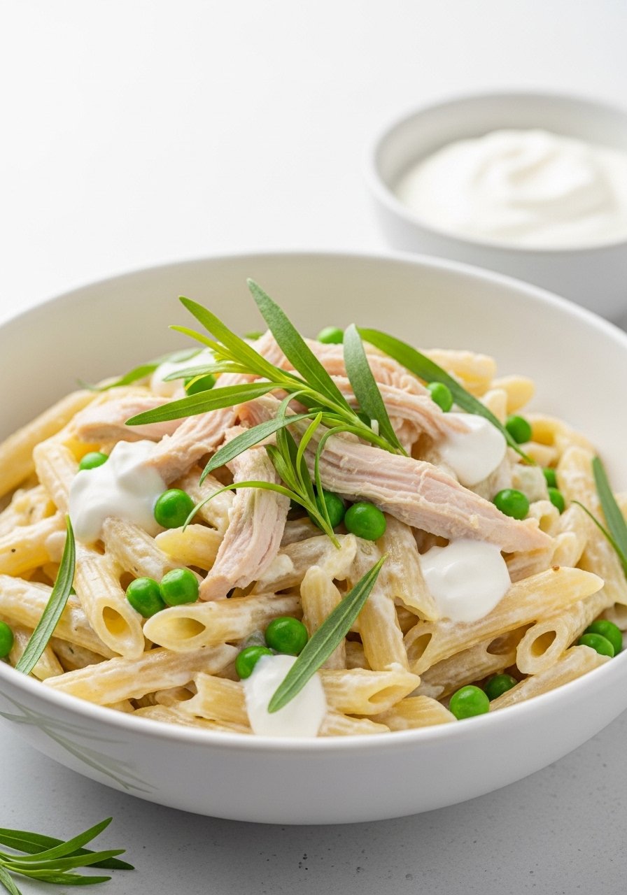 - Toss warm pasta with yogurt mixture, chicken, and peas until combined.