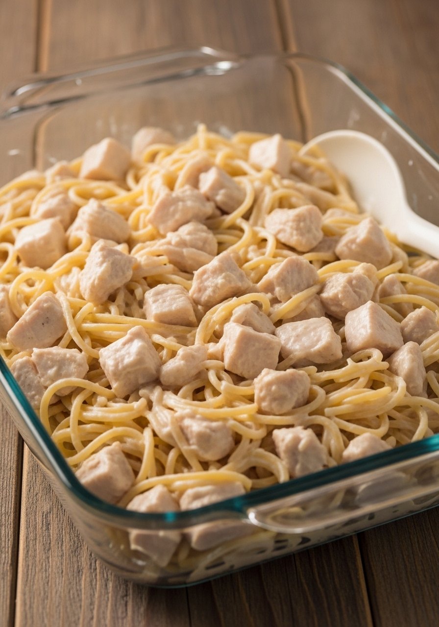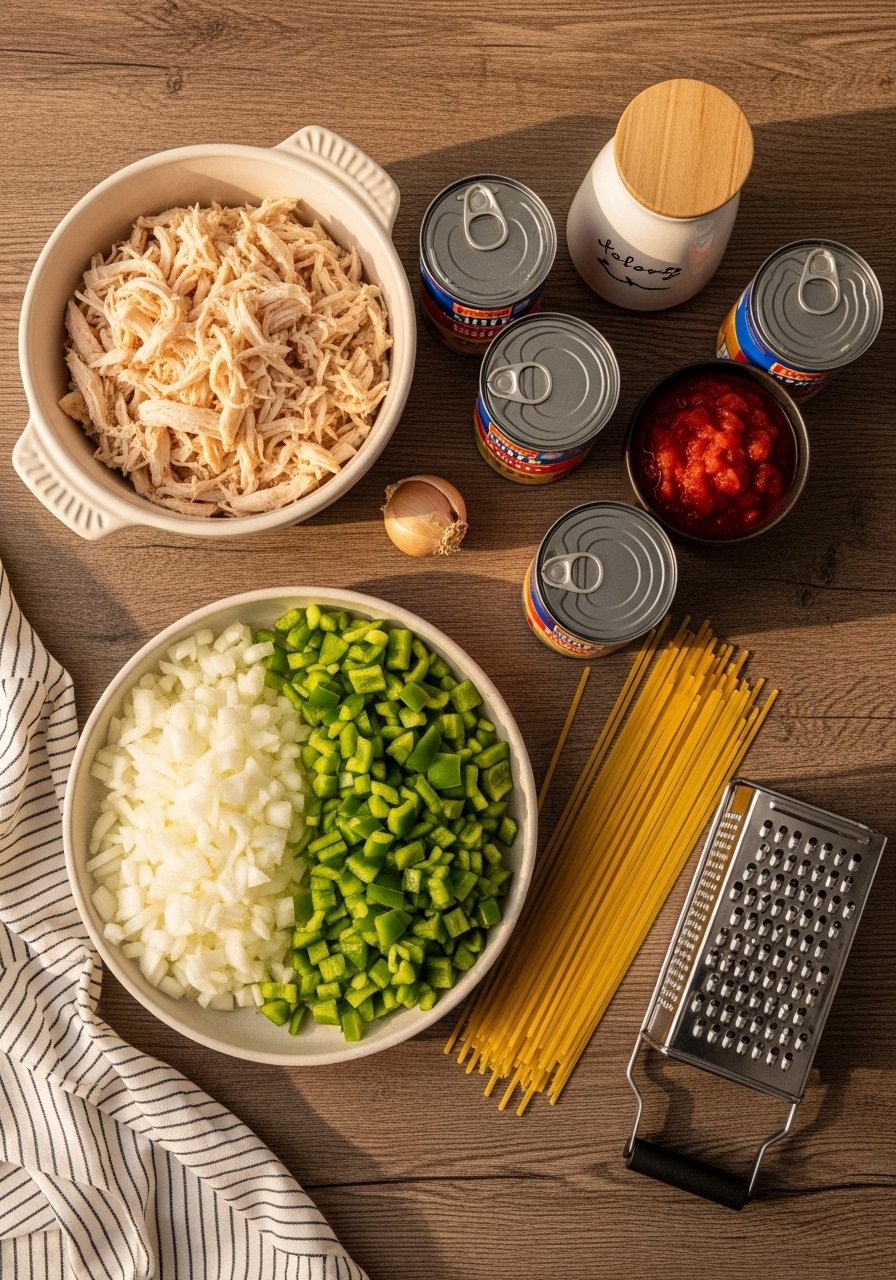 Start here so the actual cook time is fast. You’ll need 12–16 ounces of spaghetti, 3 cups shredded cooked chicken (rotisserie works great), 2 cans condensed soup (cream of mushroom or chicken), 1 cup milk, 1 can diced tomatoes with chiles if you like heat, and 2 cups shredded cheddar.
