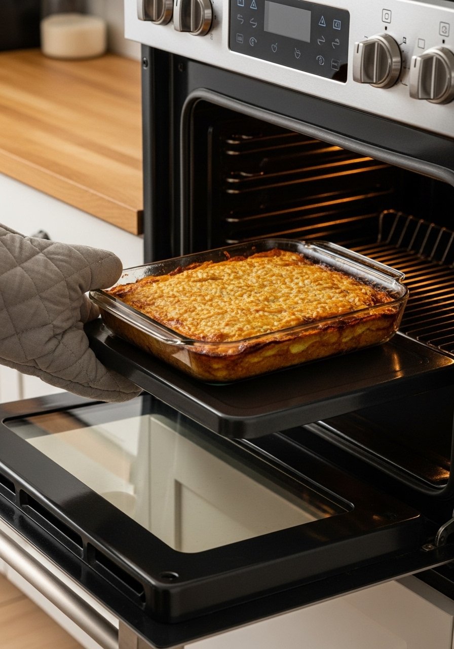 Use oven mitts when removing the pan. Let rest 5–10 minutes so it sets; it will slice cleaner and stay hot longer for serving.