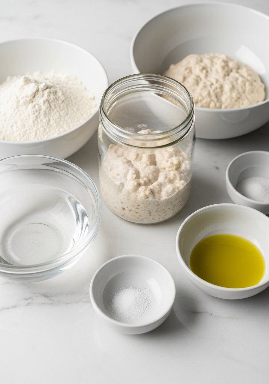 Start by weighing everything. For one 9×13 pan: 500 g bread flour, 375 g water (75% hydration), 100 g active sourdough starter, 10 g salt, 30 g olive oil. This ratio gives a chewy crumb and open holes typical of focaccia.