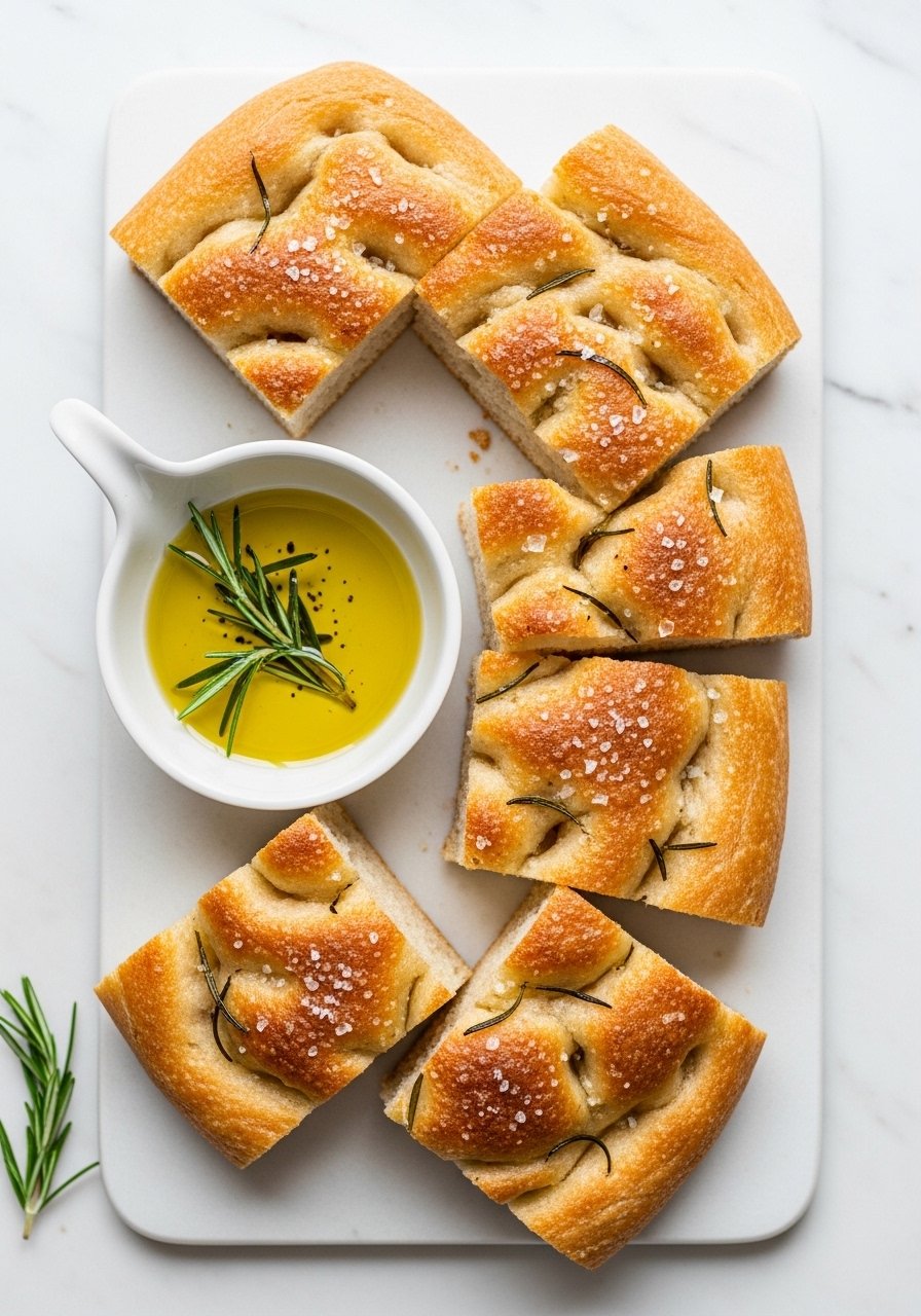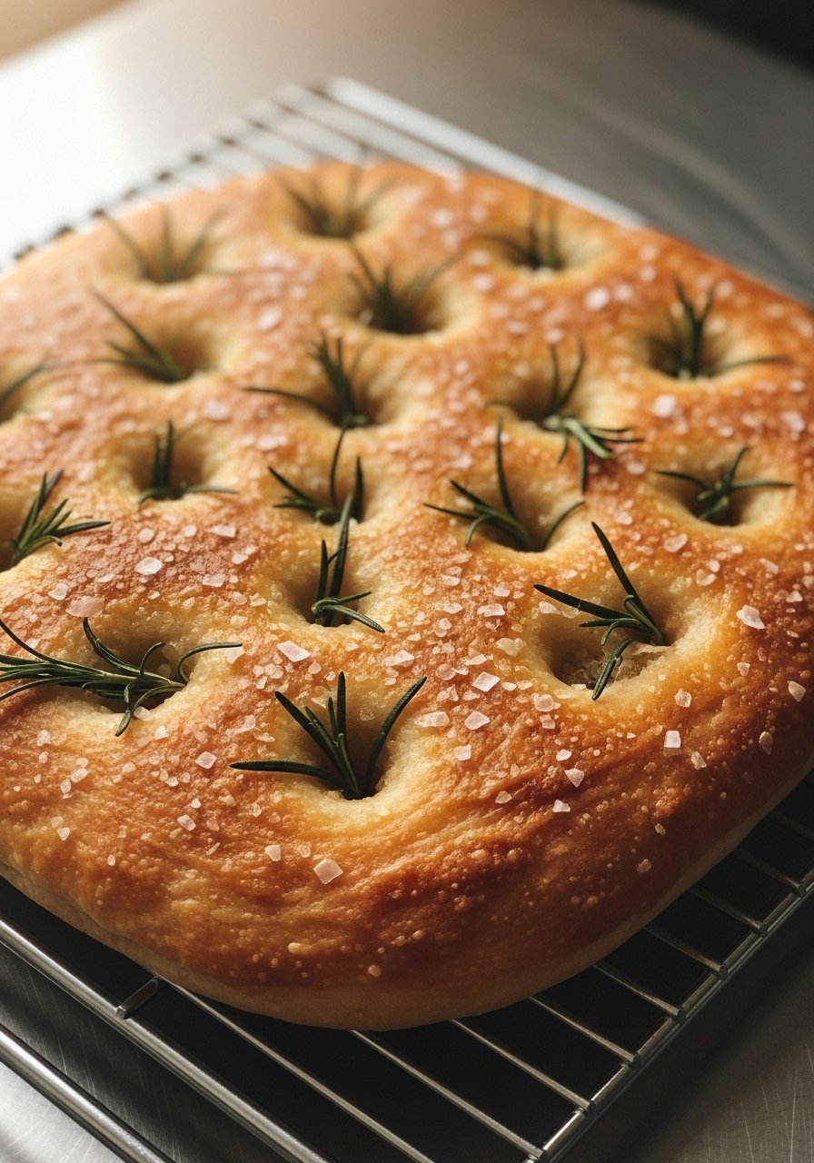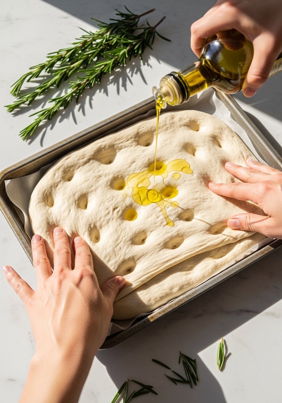 - Drizzle 2–3 tbsp olive oil across the top and add flaky salt, rosemary, or sliced olives.